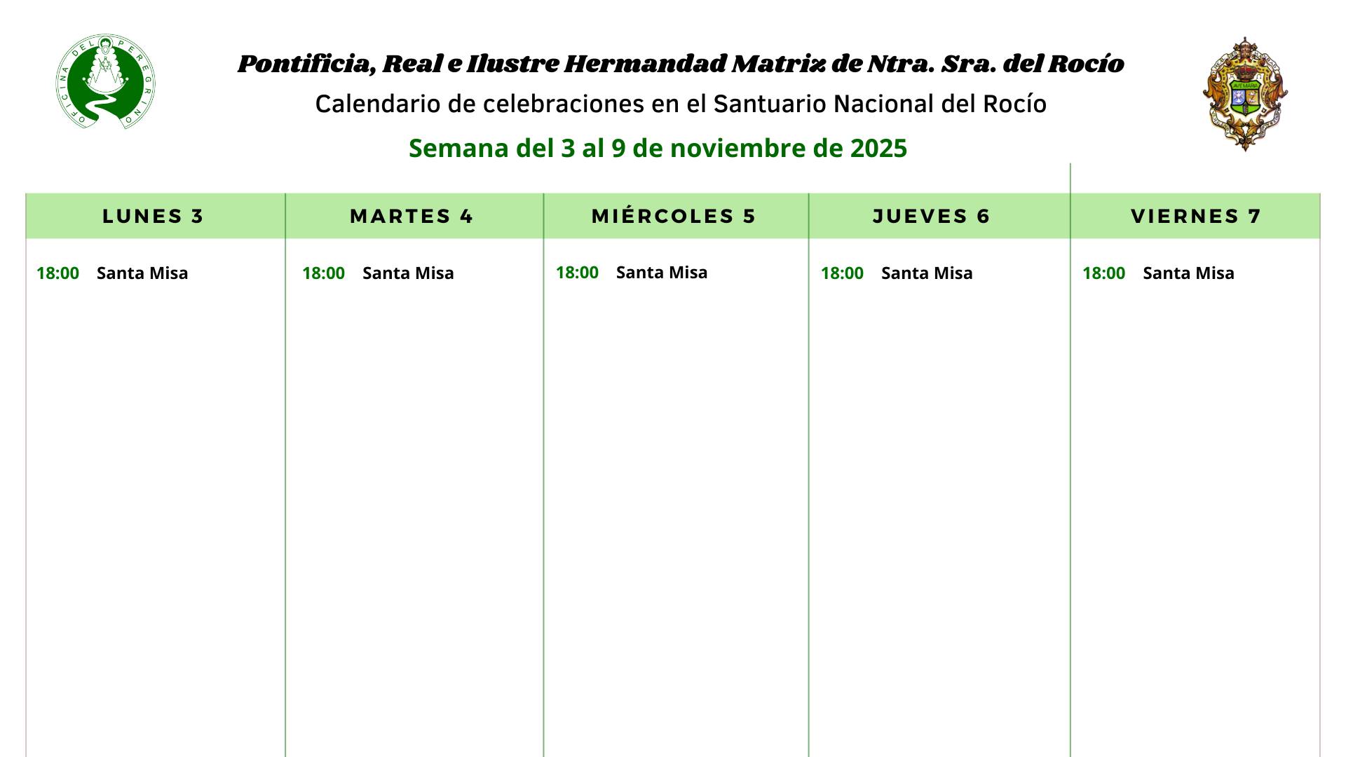 ✝ Sabatina de la Hermandad Rocio de Bruselas, en la Hermandad Del Rocio De Segovia Segovia, en la Hermandad Del Rocío De Marchena, en la Hermandad de Nuestra Señora del Rocío de Palomares del Río, en la Hermandad de Nuestra Señora del Rocío San Fernando , en la Hermandad del Rocío de La Algaba, en la Hermandad del Rocío de La Línea, de laHermandad Ntra. Sra. del Rocío Arroyo de la Miel y de la Hermandad Ntra. Sra. del Rocío de Rincón de la Victoria- Málaga.