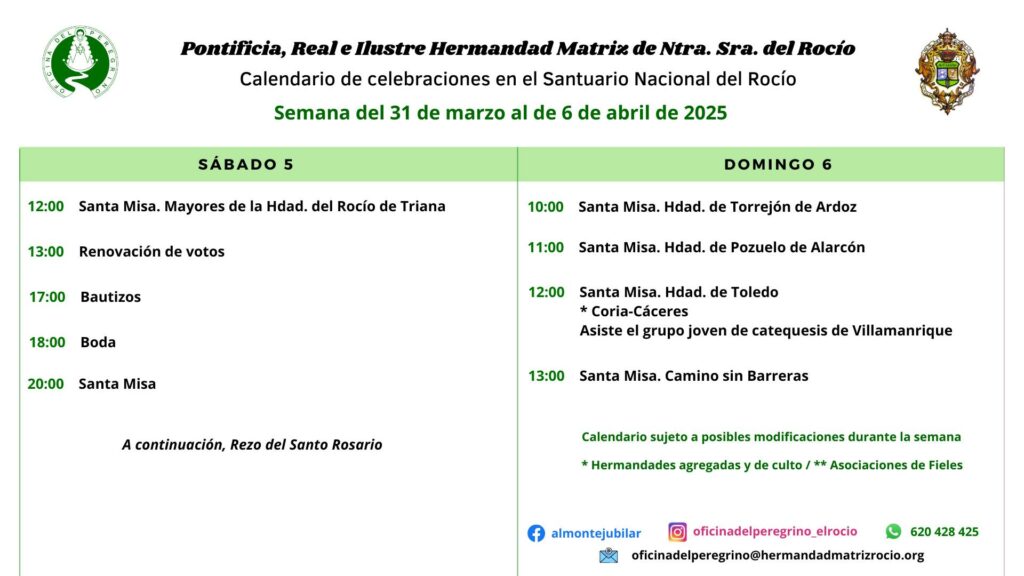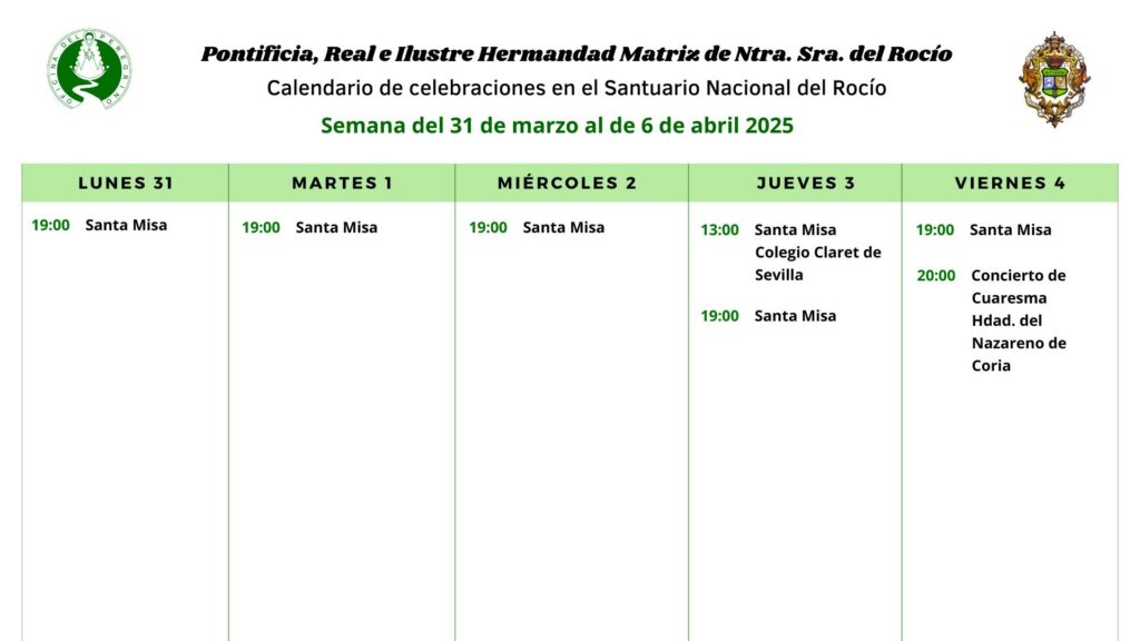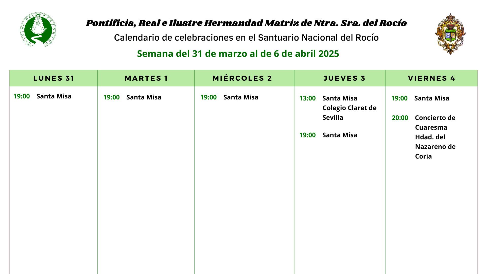 Calendario de celebraciones para la semana del 31 de marzo al 6 de abril en el Santuario de Ntra. Sra. del Rocío.