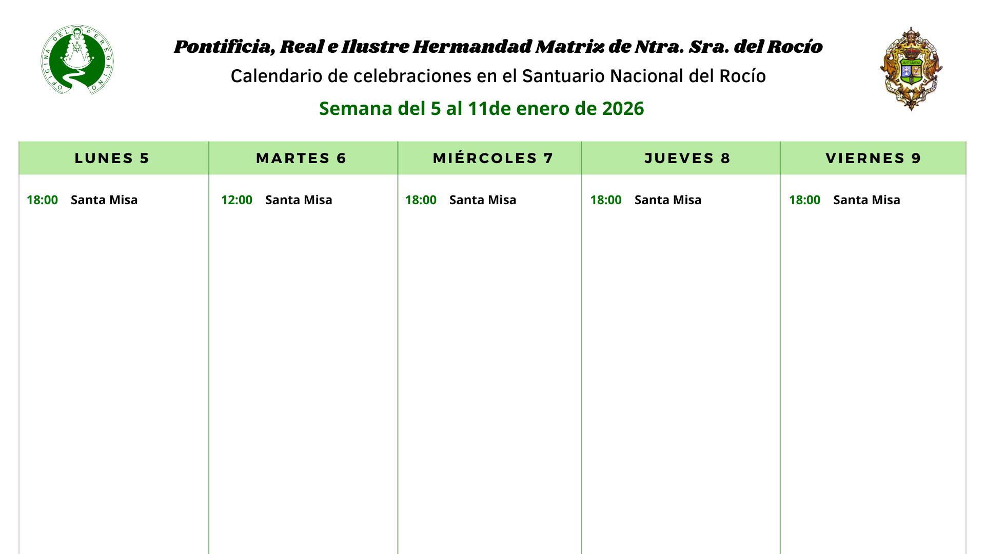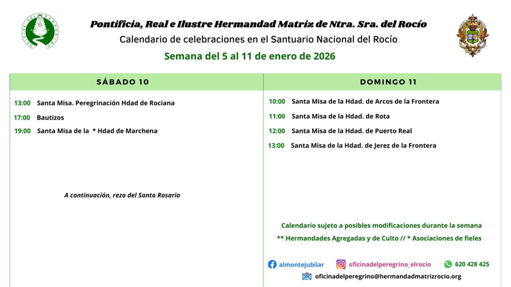 Celebraciones para la semana del 5 al 11 de enero de 2026 en el Santuario de Ntra. Sra. del Rocio