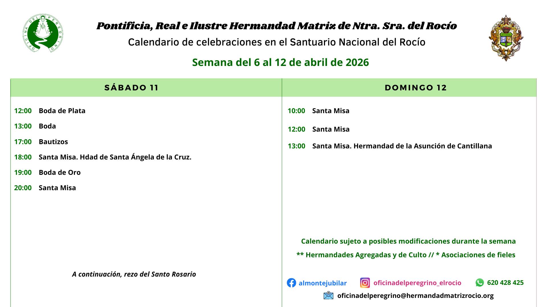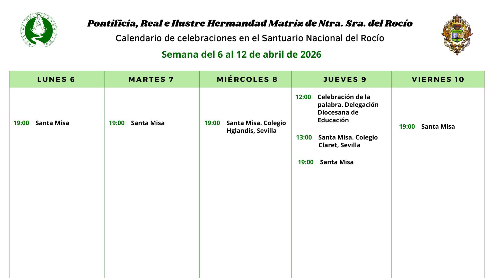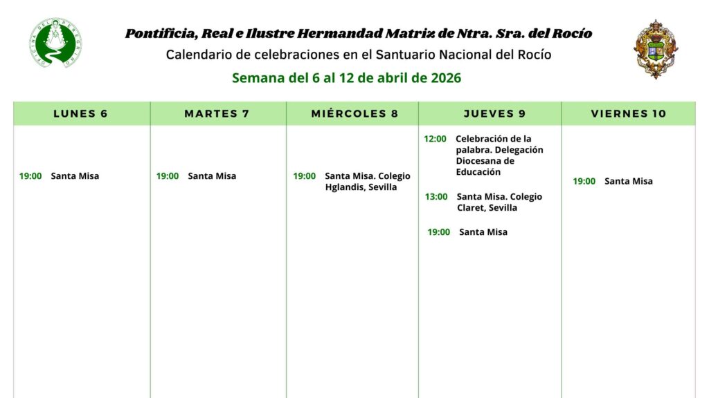 Celebraciones para la semana del 6 al 12 de abril de 2026 en el Santuario de Ntra. Sra. del Rocio
