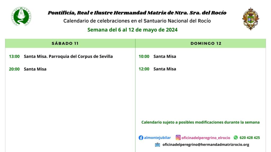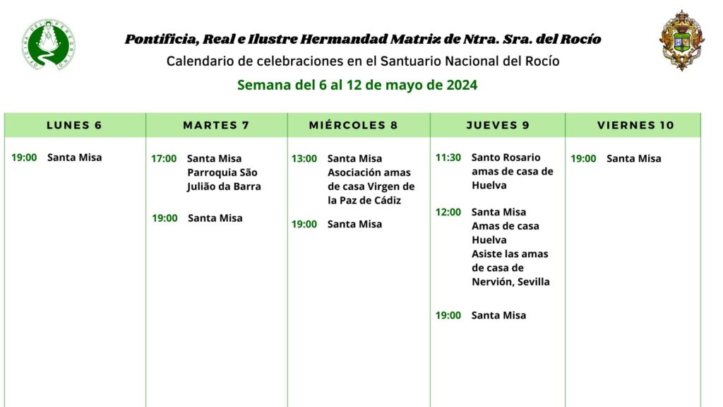 Calendario de celebraciones para la semana del 6 al 12 de mayo, en el Santuario de Ntra. Sra. del Rocío.