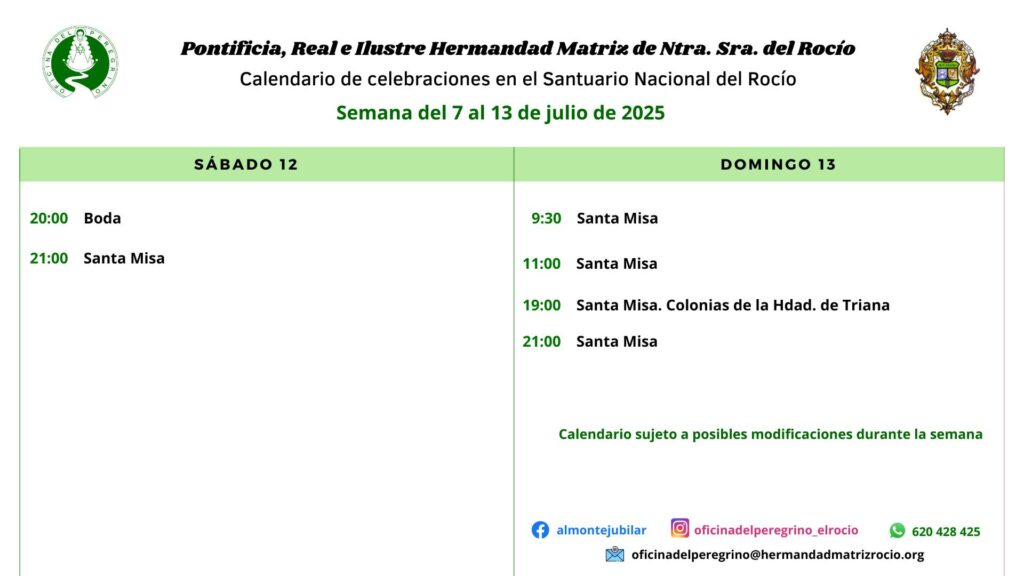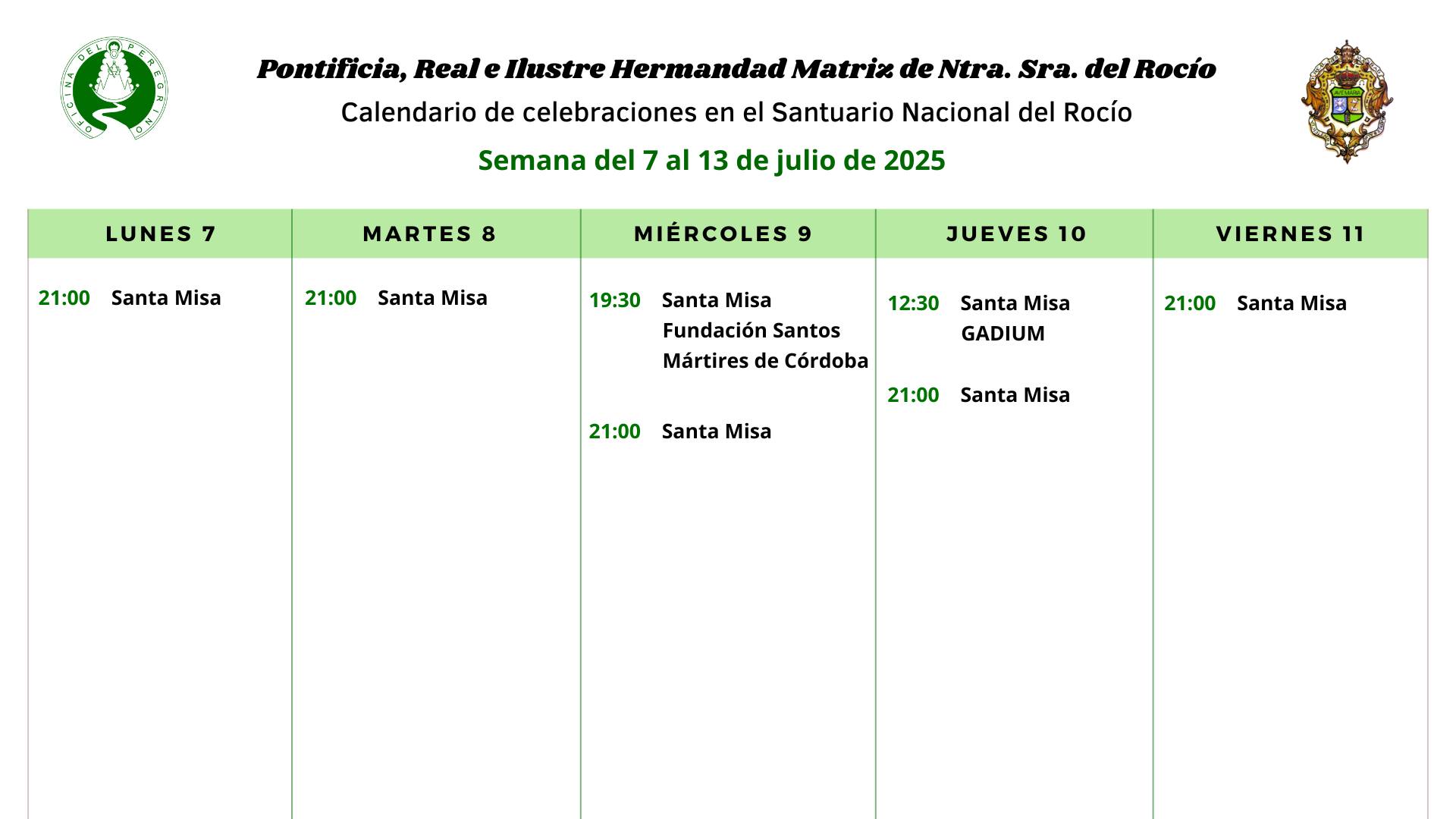 Calendario de celebraciones para la semana del 7 al 13 de julio en el Santuario de Ntra. Sra. del Rocío.
