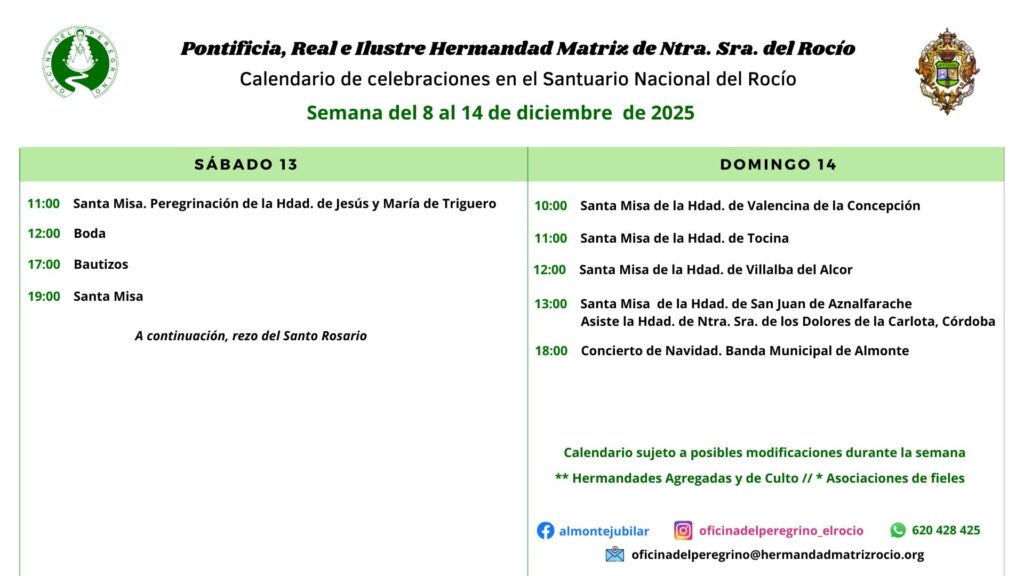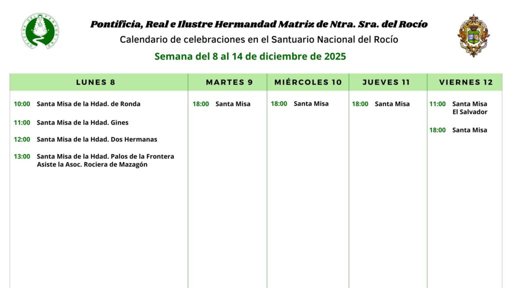 Celebraciones para la semana del 8 al 14 de diciembre en el Santuario del Rocio.