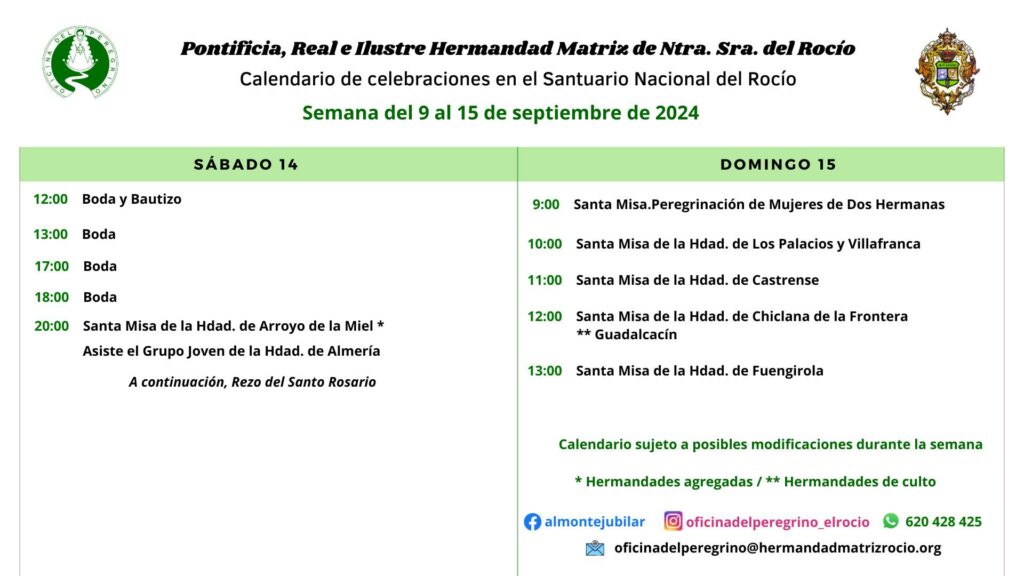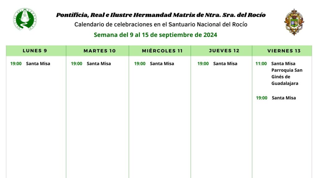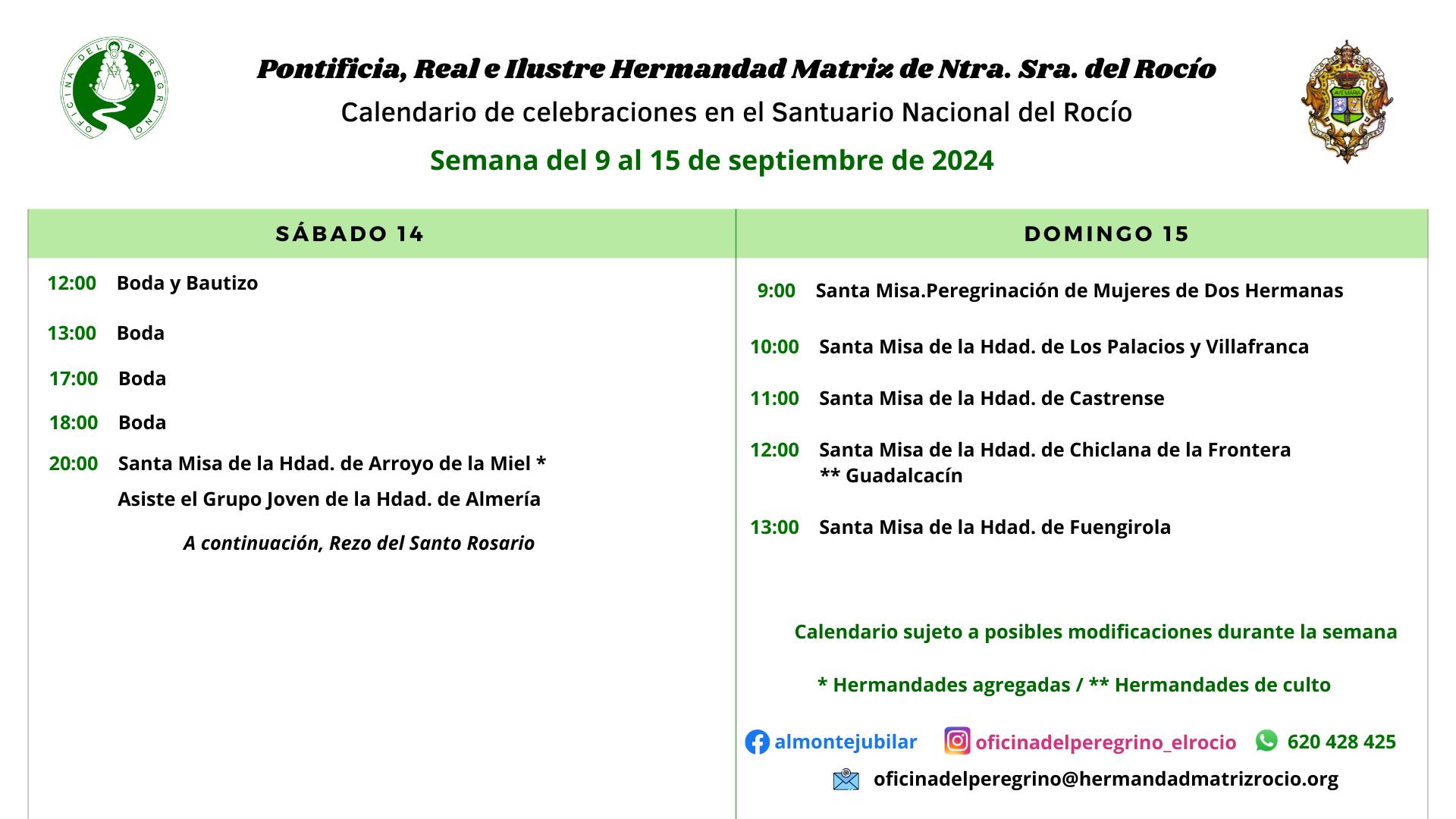 Calendario de celebraciones para la semana del 9 al 15 de septiembre en el Santuario de Ntra. Sra. del Rocío.