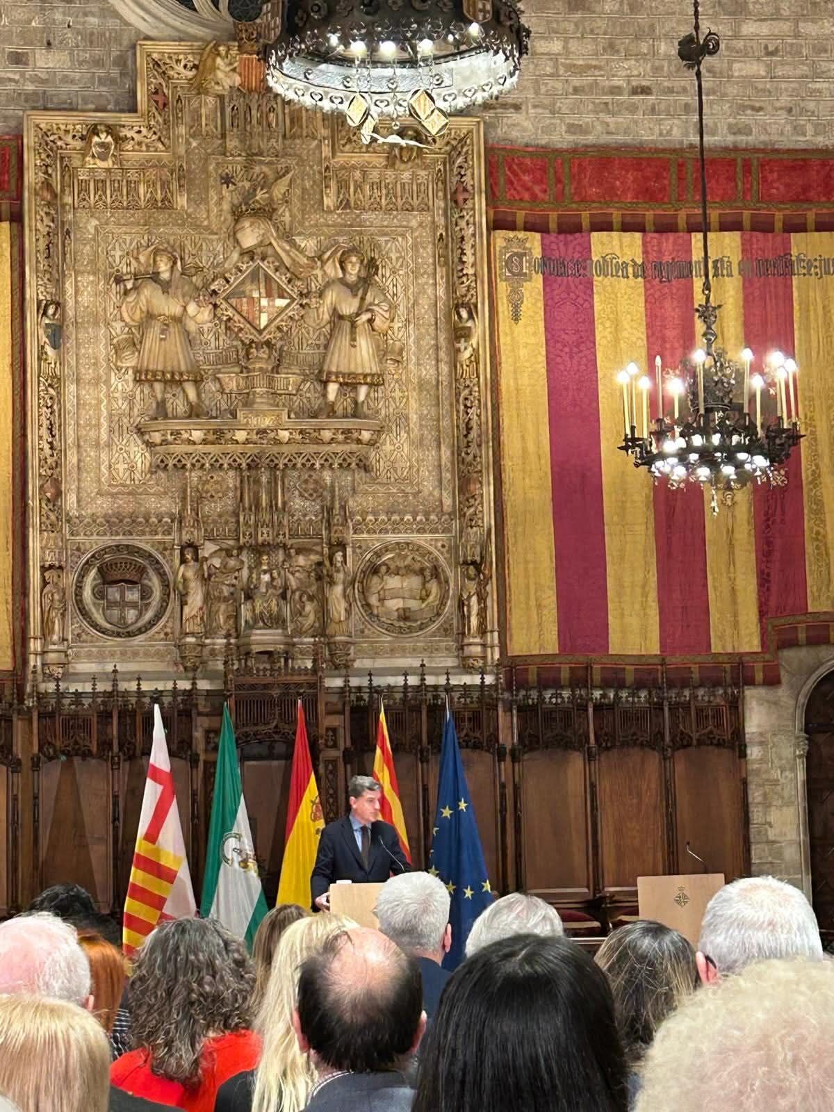 En un marco civil realmente impresionante, ayer tuve el honor de hacer una conferencia en el Saló de Cent del ayuntamiento de Barcelona sobre, » Rocío, la devoción mariana de Andalucía», organizada por la FECAC, con motivo de la celebración del Día de Andalucía en Cataluña. Un honor y una satisfacción poder hablar de la Patrona de Almonte y su devoción universal, en una tierra donde tanta devoción se le profesa, en Cataluña. Y donde El Rocío cuenta con hermandades filiales en Barcelona, Sabadell o Cornellá. O de culto, en la Comarca del Garraf.