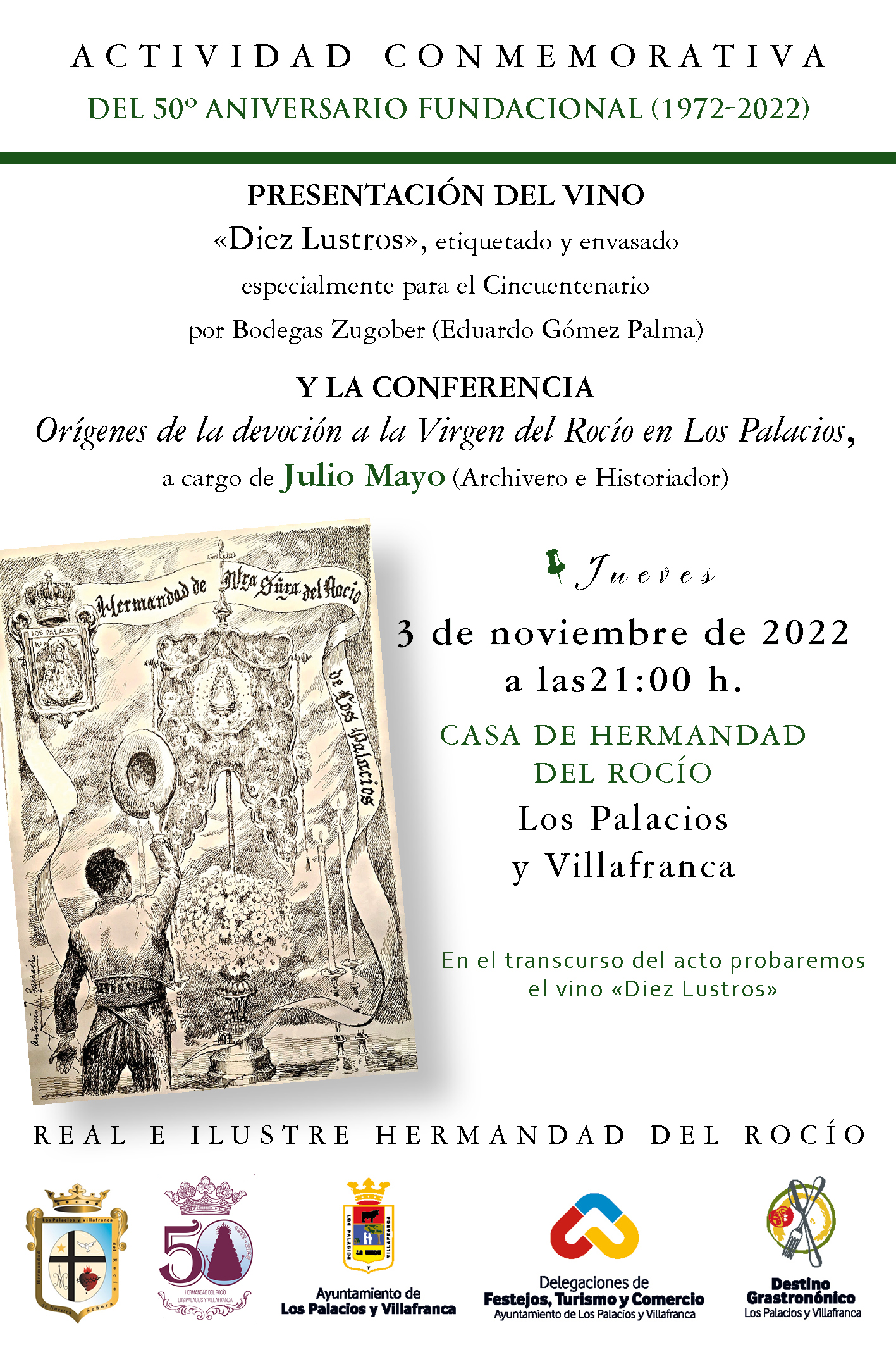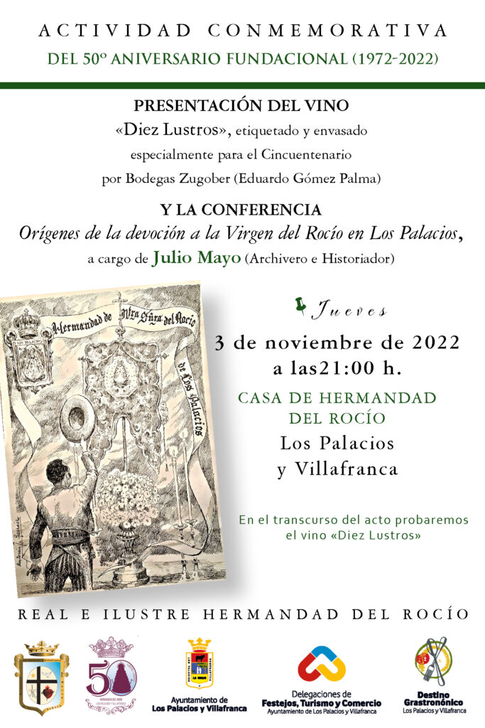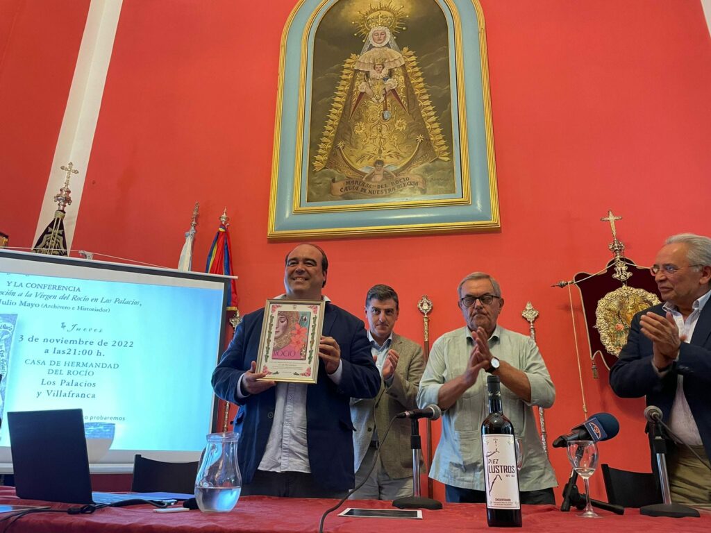 Conferencia sobre los orígenes de la devoción a la Virgen del Rocío en Los Palacios, en la Casa que la propia Hermandad posee junto al templo parroquial del Sagrado Corazón de Jesús por el historiador Julio Mayo mañana jueves 3 de noviembre de 2022.