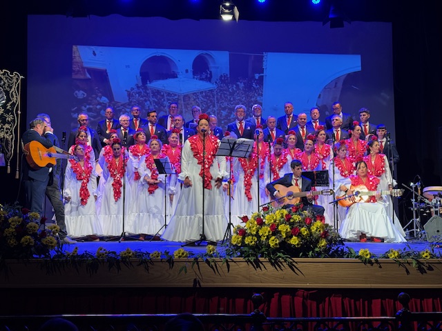 La noche alcanzó su momento culminante cuando las notas del nuevo repertorio, compuesto por el director del coro, David Carrasco, comenzaron a llenar el teatro. Con una combinación de sevillanas, plegarias y rumbas, cada interpretación evocó vivencias, caminos y sentimientos que conectaron profundamente con el público. El recital comenzó con la plegaria Otra vez mi gente, que da nombre al disco, y continuó con temas como Qué ya me voy, Amanecer de esperanza, Tú me llenas el alma y Dios te salve Rocío. También se incluyeron rumbas como Fe del rociero y Locura de Andalucía, cerrando con sevillanas como Este año es diferente y las Letanías rocieras.En un momento especialmente emotivo, Carrasco invitó al escenario a tres mujeres que han desempeñado recientemente el cargo de hermana mayor: Cristina Serrat, Mariló Palanco y María José Muiño. Asimismo, representando al pueblo de Almonte, subió un entrañable amigo del director conocido cariñosamente como ‘Rambo Mecoleta’.