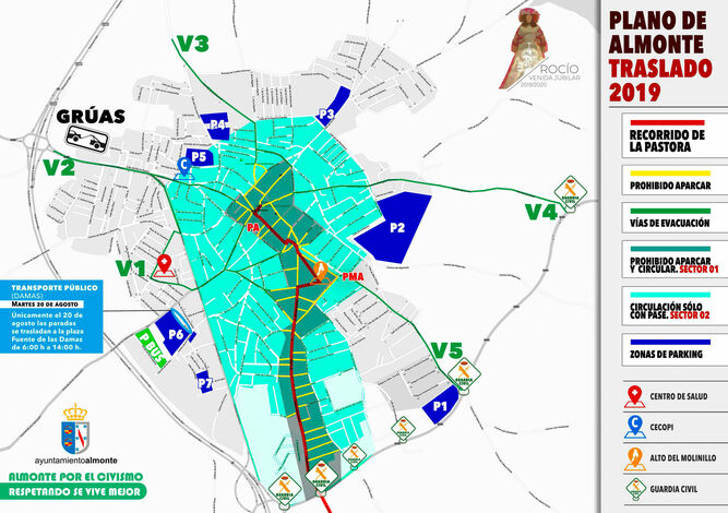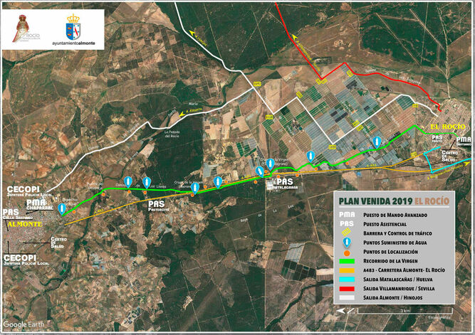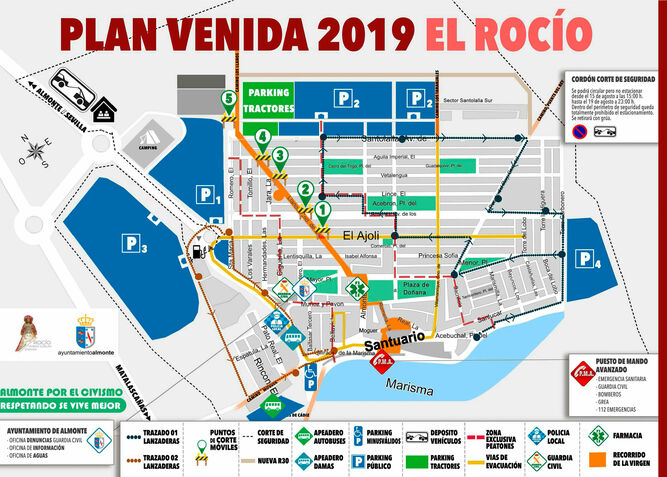 Plan de seguridad establecido por el Ayuntamiento de Almonte con motivo de la Venida de la Virgen del Rocío en 2019.