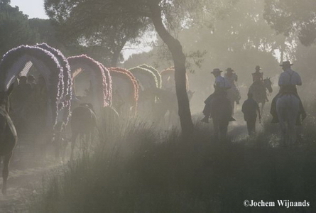 Los niños juegan junto a las carriolas a ser el mejor caballista, las niñas se atusan coquetamente el pelo que adornan con flores del camino; alguien corta romero para aquella peregrina y las sevillanas dedicadas a la Virgen inundan los caminos y la alegría de la caravana contagia a las amapolas que lucen un rojo más intenso y la jara parece como si se hubiese perfumado para la ocasión, parece que las adelfas son mas señoriales, el campo estalla de flores.