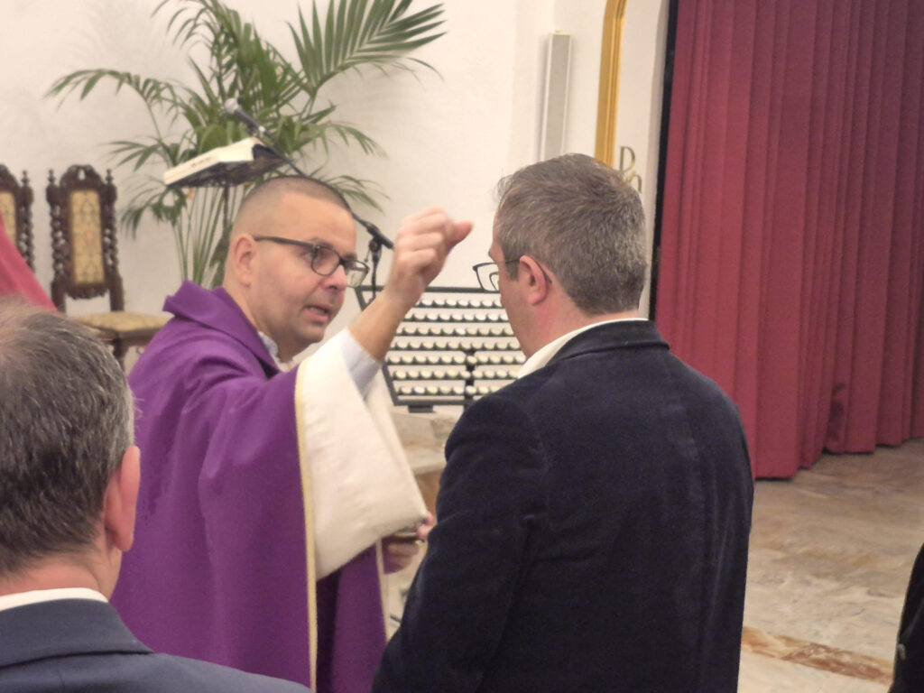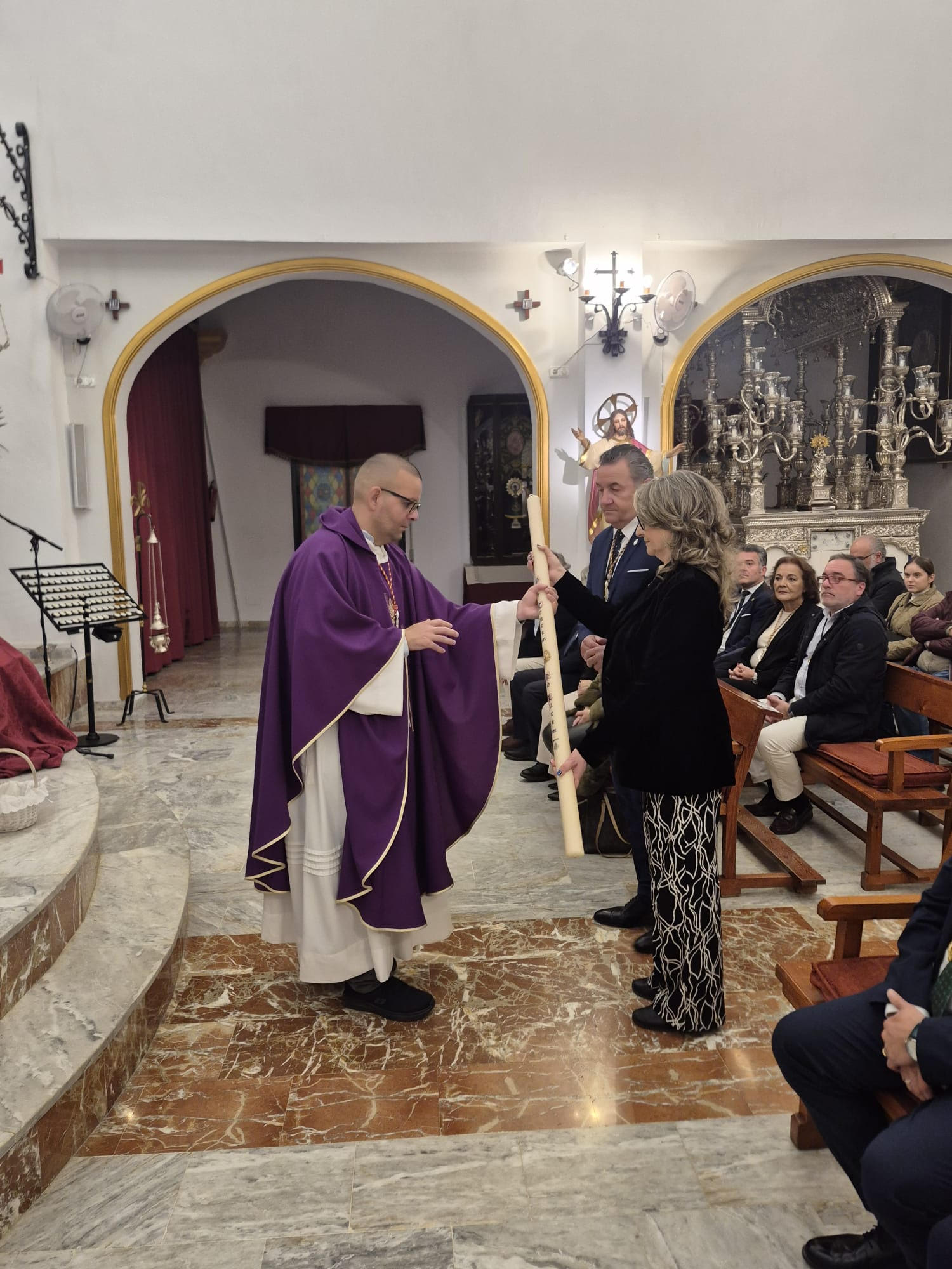 La recepción del cirio estuvo encabezada por el presidente de Emigrantes, José Francisco Garrido, acompañado por el hermano mayor, Jesús Manuel Muñoz, miembros de la junta de gobierno y numerosos devotos de ambas corporaciones. Durante la Eucaristía celebrada con motivo del inicio de la Cuaresma, el cirio fue bendecido por el párroco de La Merced, Jaime Jesús Cano, quien ocupó la sagrada cátedra en una ceremonia marcada por la solemnidad y el recogimiento. La celebración estuvo acompañada musicalmente al órgano por Jesús Frichi.