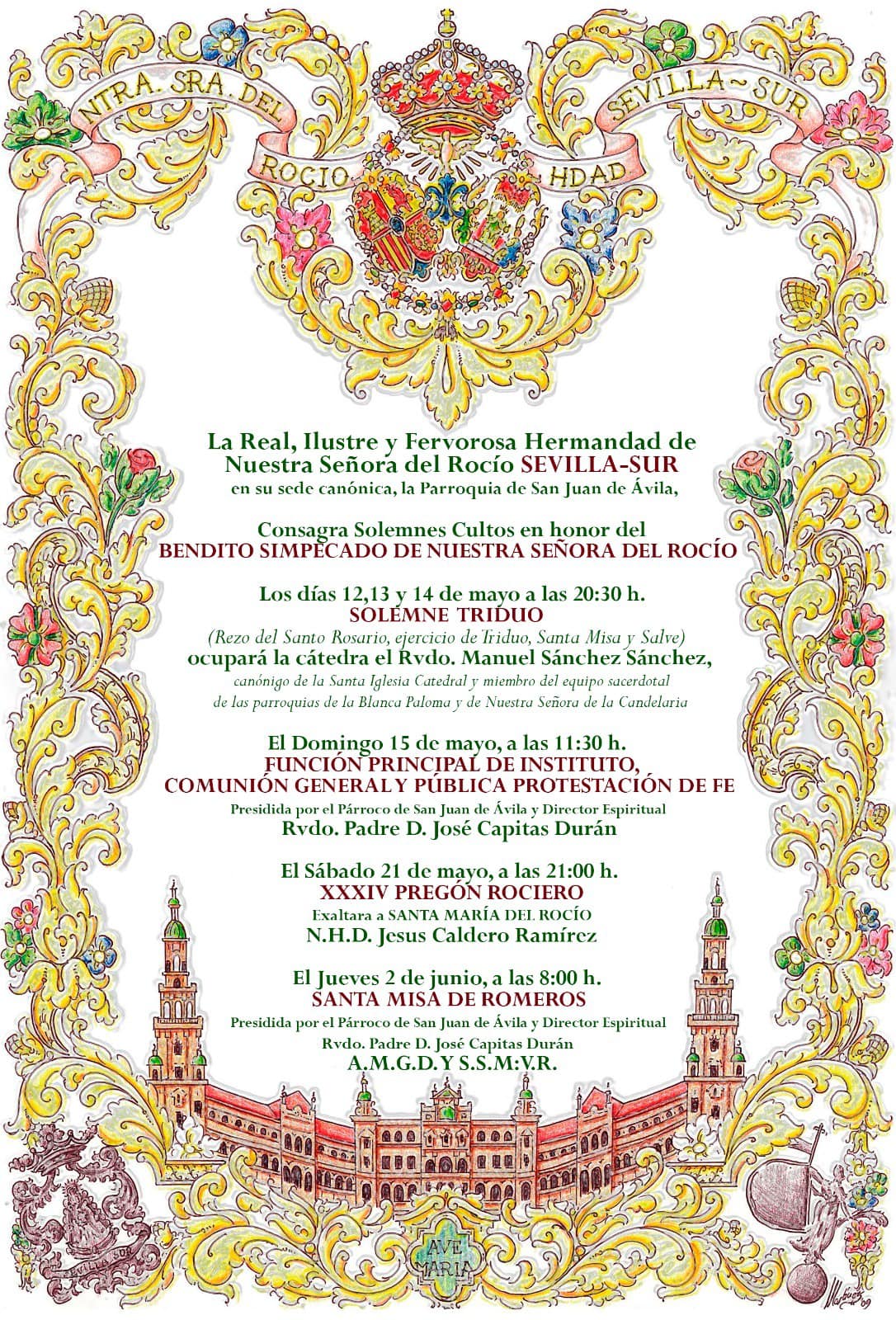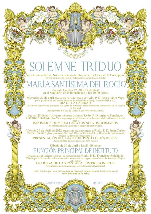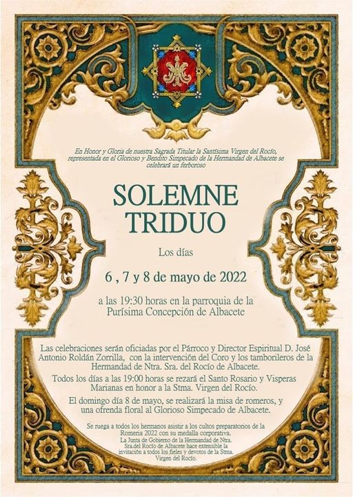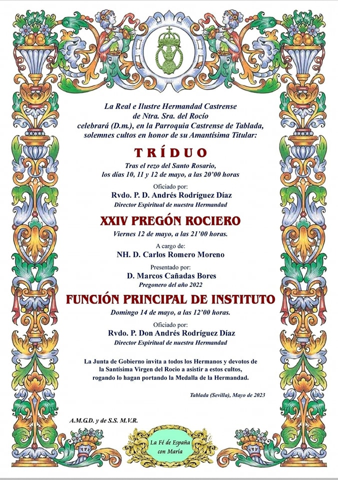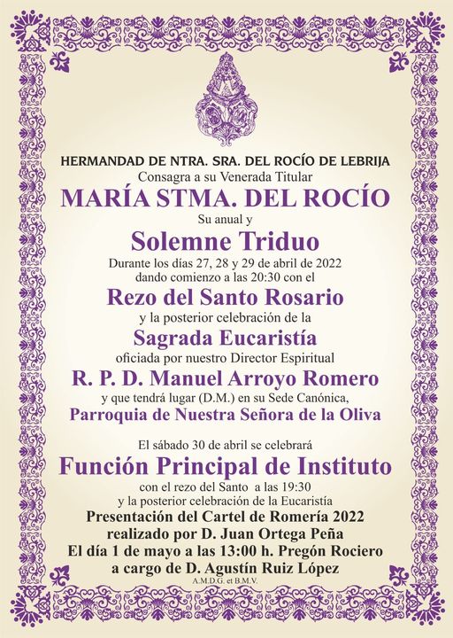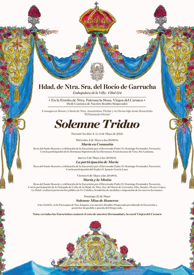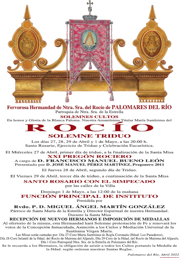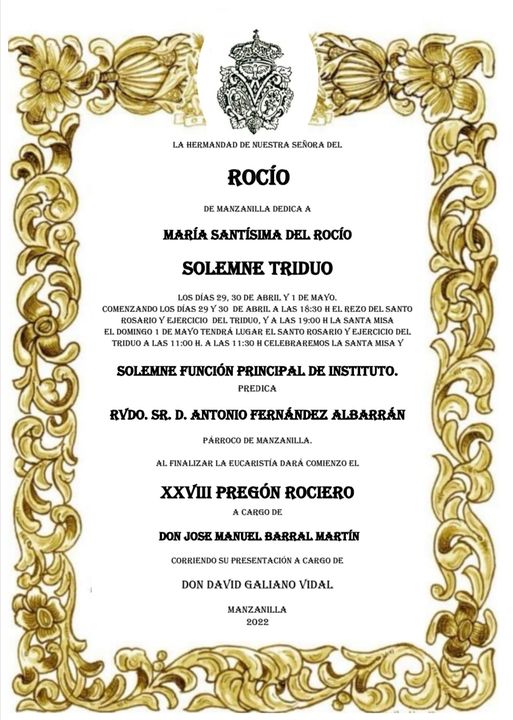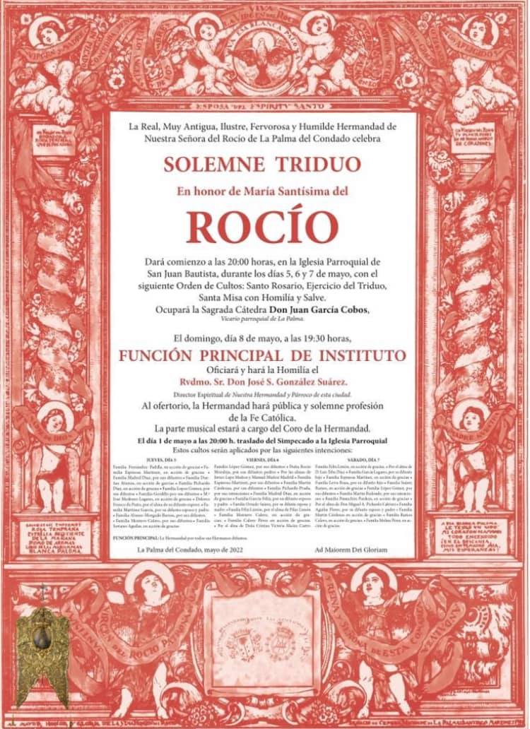 Solemnes Cultos, Novena y Romería que la Pontificia, Real e Ilustre Hermandad Matriz de Ntra. Sra. del Rocío de Almonte, consagra en honor de su venerada titular, María Santísima del Rocío. Patrona desde el año 1653 de la Muy Antigua y Noble Villa de Almonte.