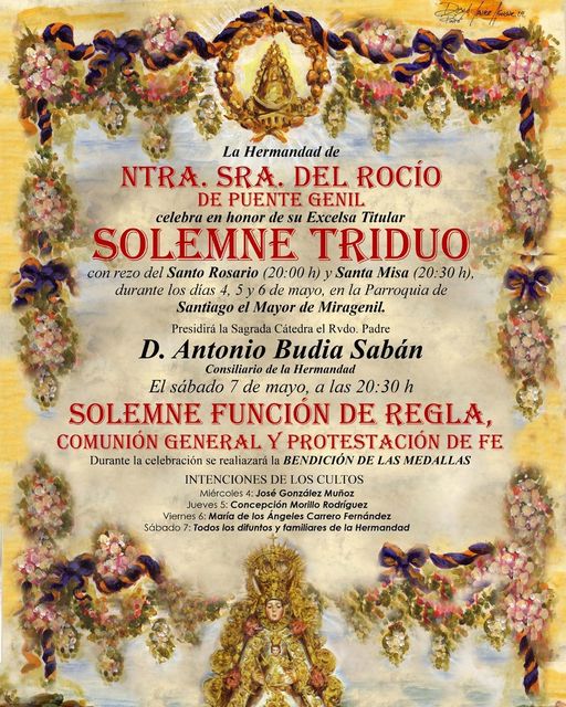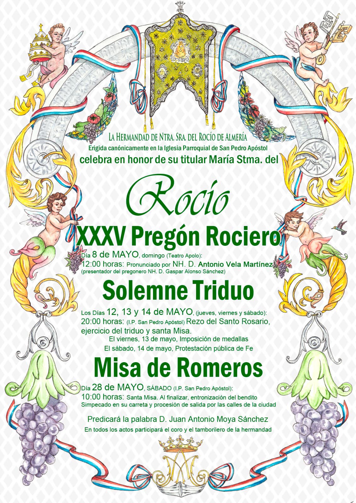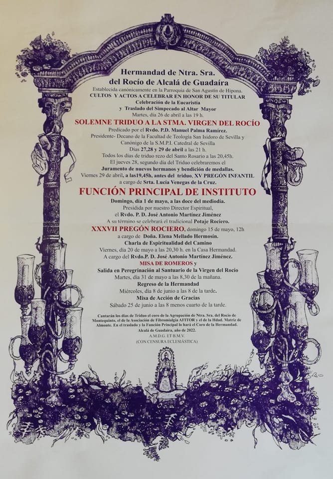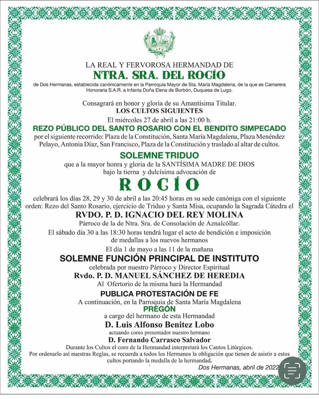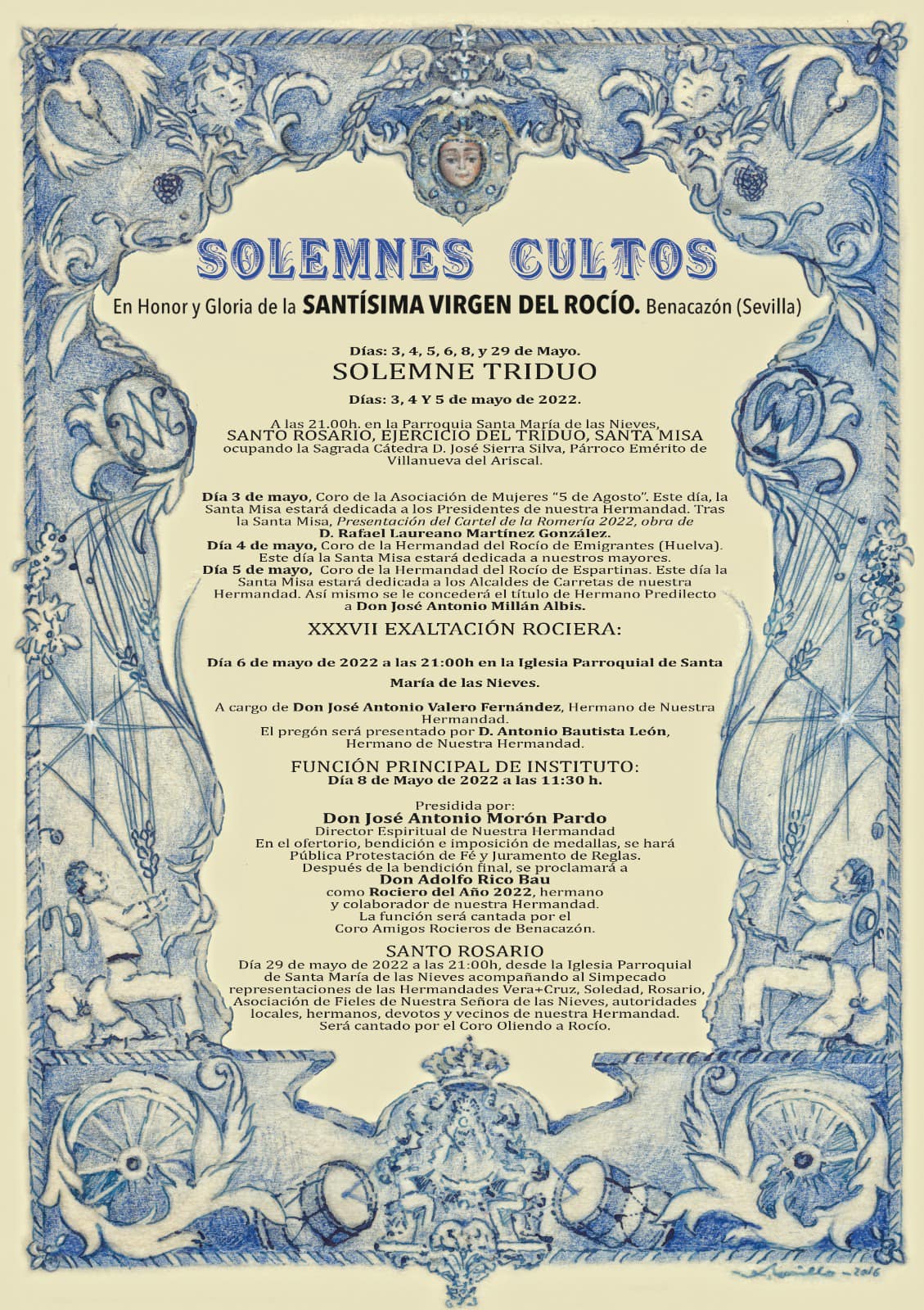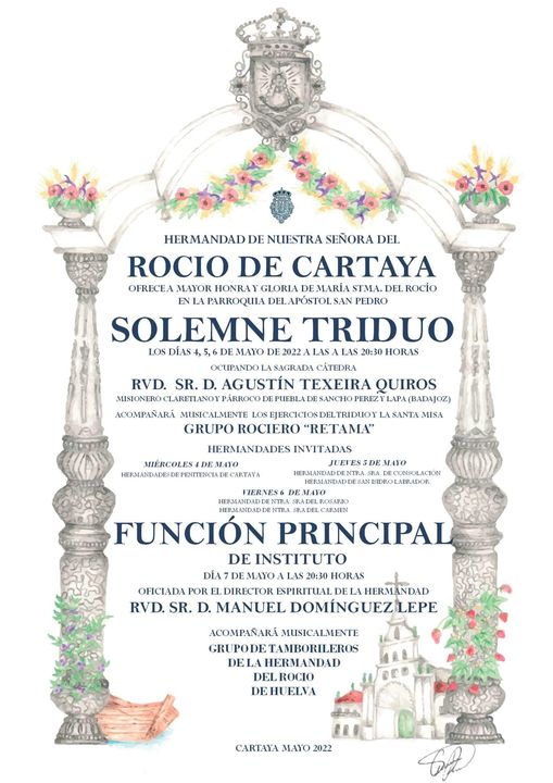 Solemnes Cultos, Novena y Romería que la Pontificia, Real e Ilustre Hermandad Matriz de Ntra. Sra. del Rocío de Almonte, consagra en honor de su venerada titular, María Santísima del Rocío. Patrona desde el año 1653 de la Muy Antigua y Noble Villa de Almonte.