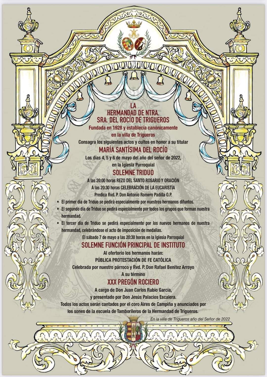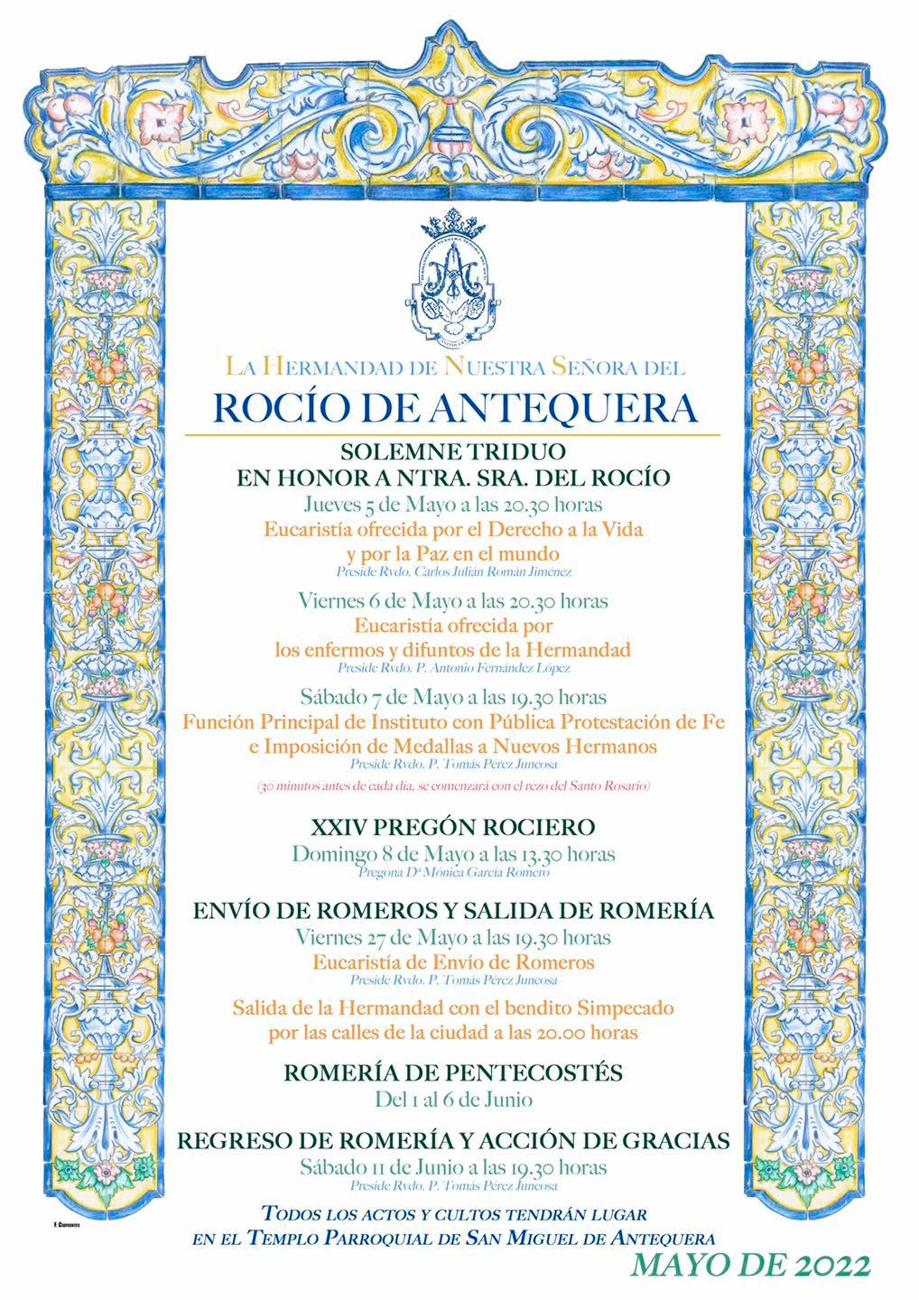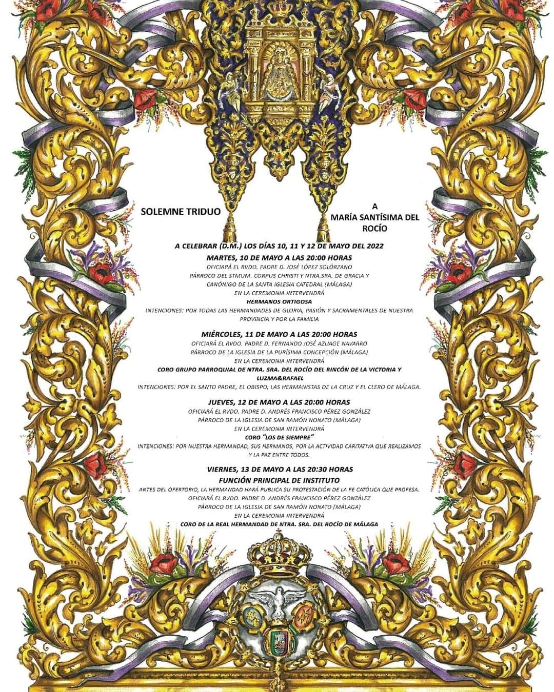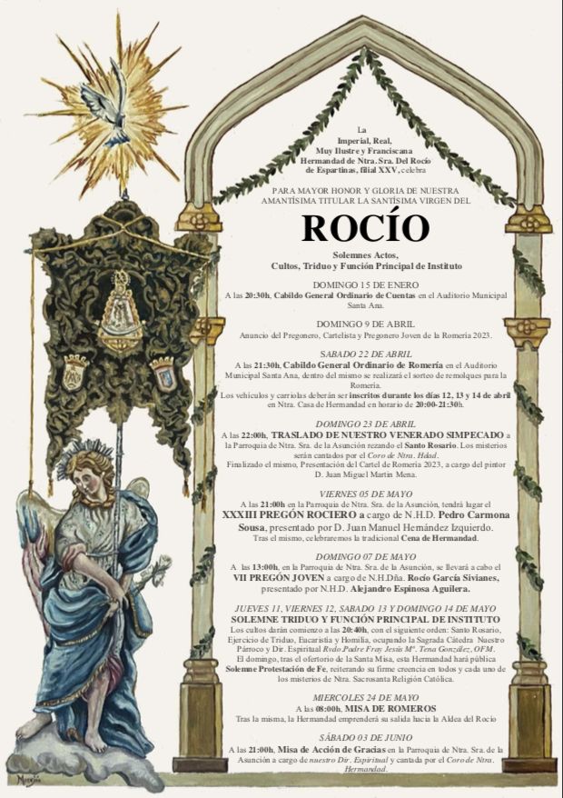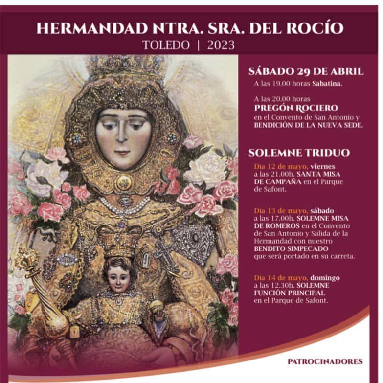 Solemnes Cultos, Novena y Romería que la Pontificia, Real e Ilustre Hermandad Matriz de Ntra. Sra. del Rocío de Almonte, consagra en honor de su venerada titular, María Santísima del Rocío. Patrona desde el año 1653 de la Muy Antigua y Noble Villa de Almonte.