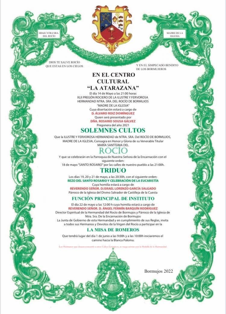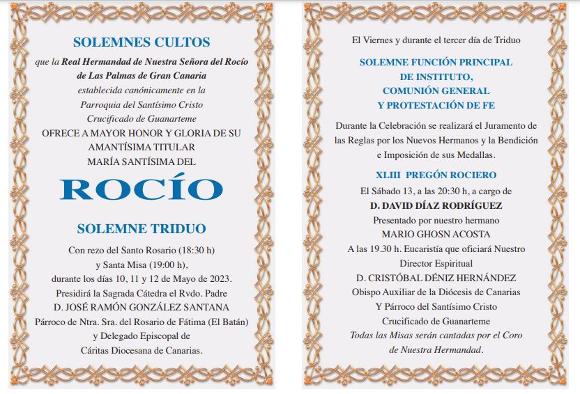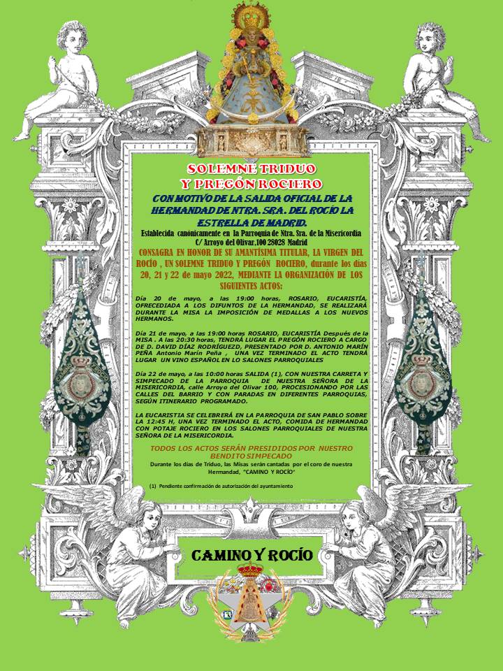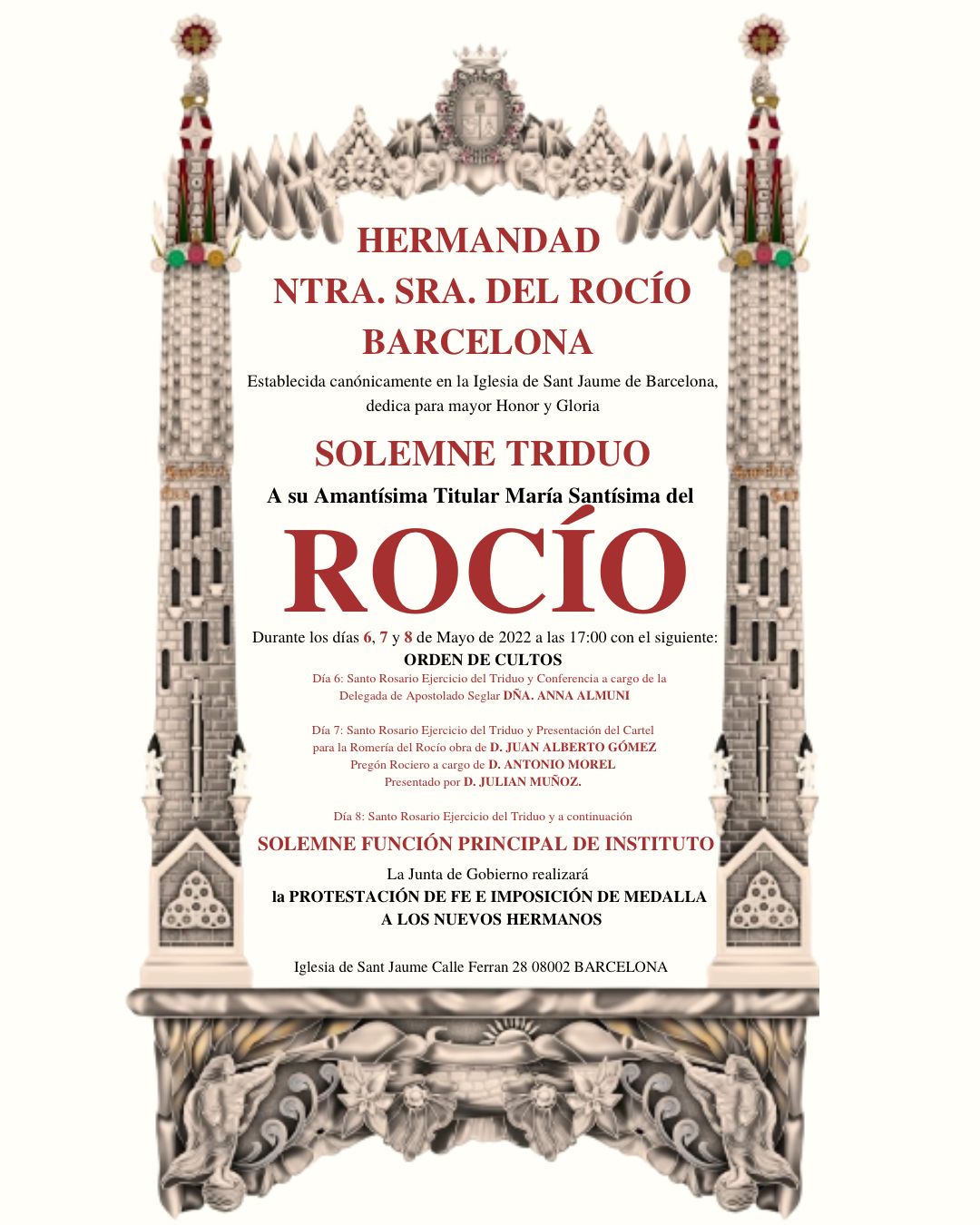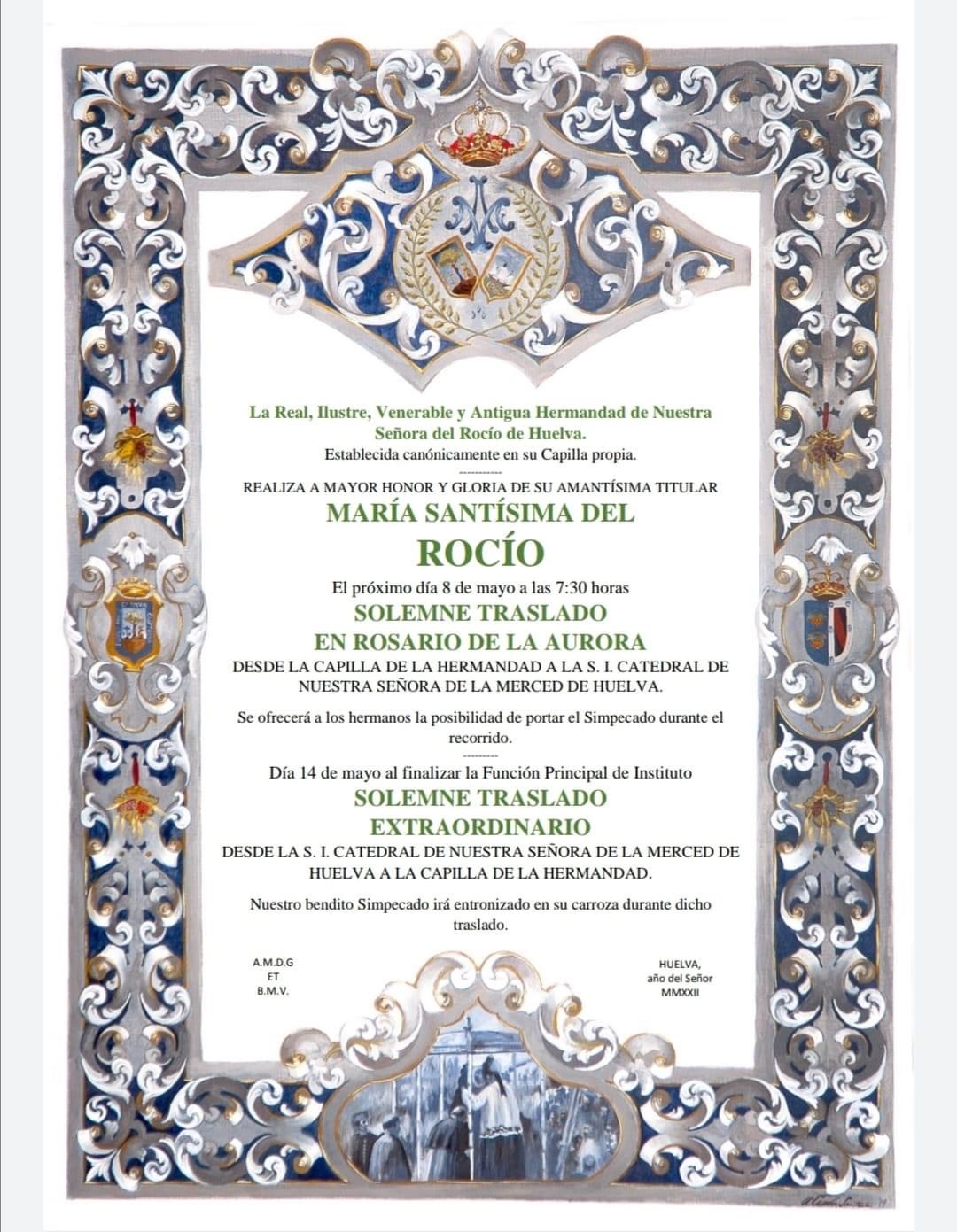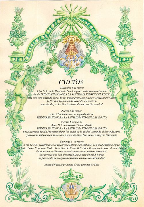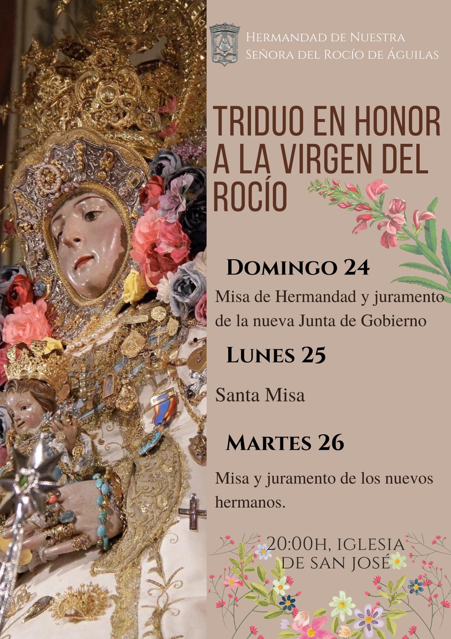 Solemnes Cultos, Novena y Romería que la Pontificia, Real e Ilustre Hermandad Matriz de Ntra. Sra. del Rocío de Almonte, consagra en honor de su venerada titular, María Santísima del Rocío. Patrona desde el año 1653 de la Muy Antigua y Noble Villa de Almonte.