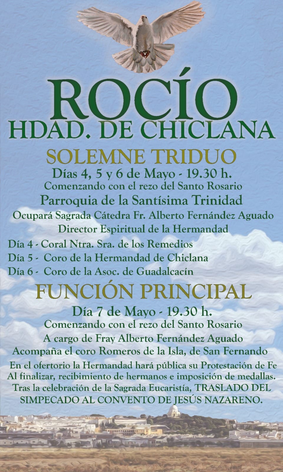 Domingo, 15 de mayo. Rvdo. P. D. José Antonio Castilla Rodríguez, Vicario Parroquial de la de Ntra. Sra. de la Asunción, de Almonte. Canto: Coro de la Hermandad de Ntra. Sra. del Rocío de La Puebla del Río.