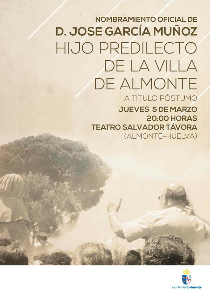 El próximo 5 de marzo, tendrá lugar en el Teatro Municipal Salvador Távora, el acto homenaje a D. José García Muñoz, Hijo Predilecto a título póstumo de la Villa de Almonte.