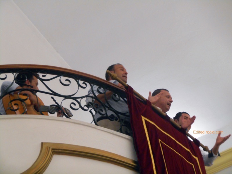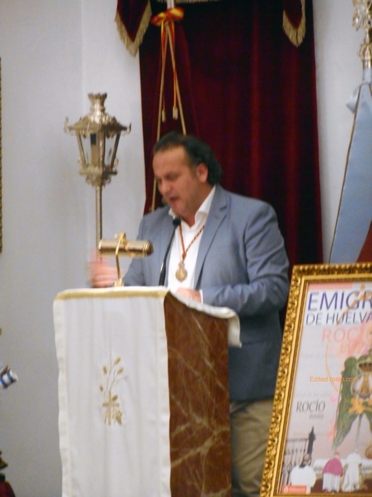 Proseguía David Carrasco su exaltación con añorando caminos pasados para llegar a interpelar: “¿Quén ha dicho que Emigrantes no es rociera? Pues que nadie lo ponga en duda/ que esta hermandad lucha día tras día/ por esta devoción rociera./ Que por caminos de siempre/ nunca faltaron a la cita/ desandando las vereas./ Si en su largo peregrinar/conoce tantos caminos/ para llegar a la aldea./ Si conoce alegrías y desencantos/ dulzuras y sinsabores/ de esta fe marismeña./ Si bebe de esta fuente inagotable/ que mana de esta fe/ que nunca acaba en nuestra vida certera./ Si llegando el mes de mayo/ se convierte en plegaria, rezo y petición/ para esa guapa almonteña”.