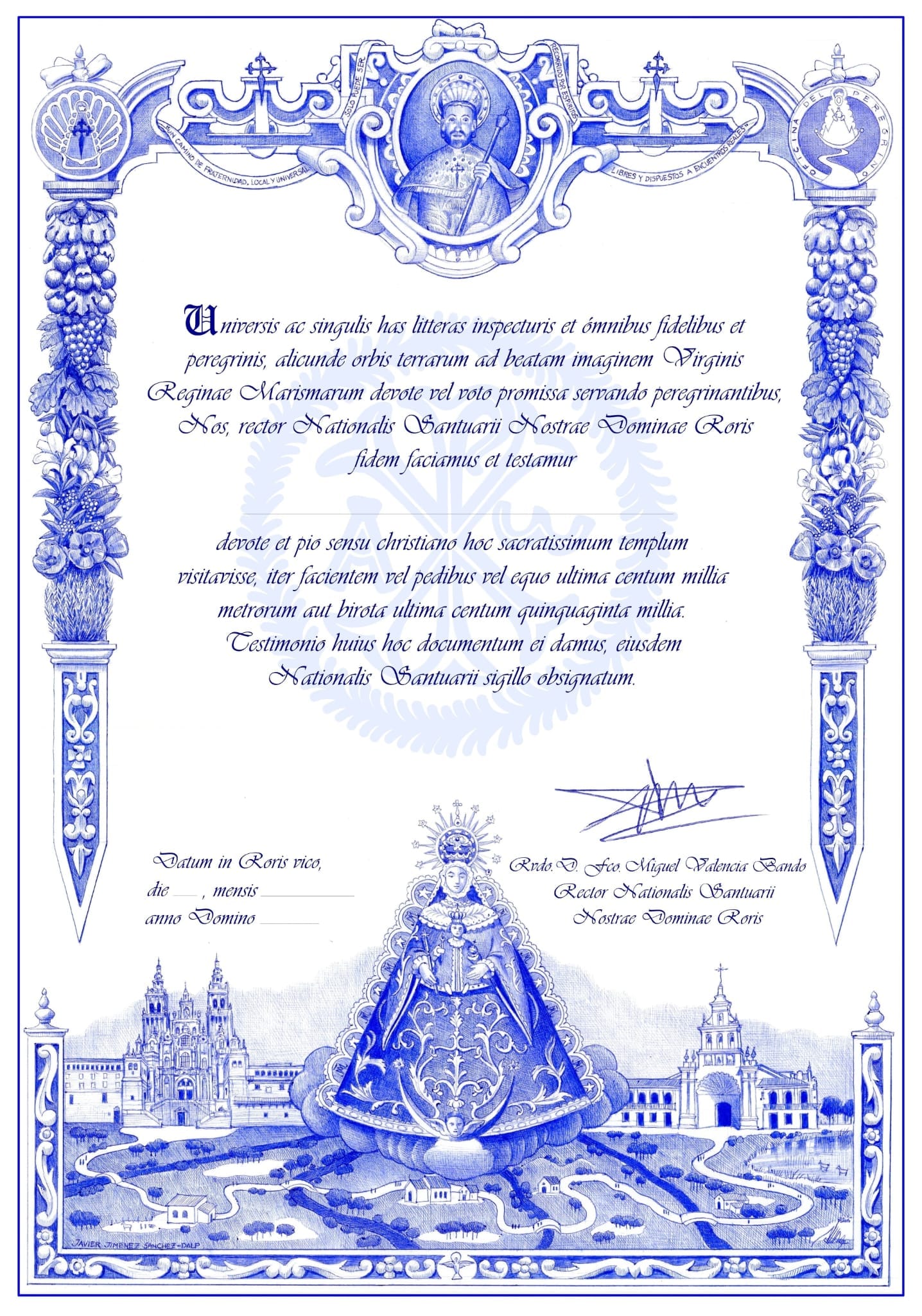 Santiago Apostol preside la parte superior, norte del certificado y la Virgen del Rocío el sur, en una representación al modo como la idealizaron los artistas de tiempos inmemoriales en los que ya Ella bendecía a quien iba a visitarle.