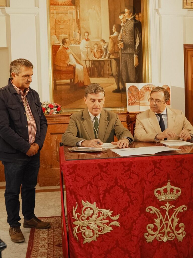 Ha sido firmado por el presidente de la Hermandad Matriz, Santiago Padilla, junto con el bienhechor que va a sufragar su coste. Un proyecto que se llevará a cabo en los próximos meses por el referido pintor, artista que cuenta ya con importantes obras en el Santuario del Rocío, descendiente por línea materna de almonteños.
