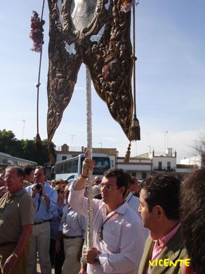 Celedonio, con su mágico toque de tamboril, fue anunciando la comitiva, la cual estaba preparada para caminar hasta nuestra MADRE, y así fue, en manos de sus hijos los Trianeros, llevamos nuestro Stmo. Simpecado hasta sus plantas, y allí estaba ELLA, sonriente de ver a sus hijos Trianeros a sus pies, se le notaba contenta de tenernos allí con ELLA.