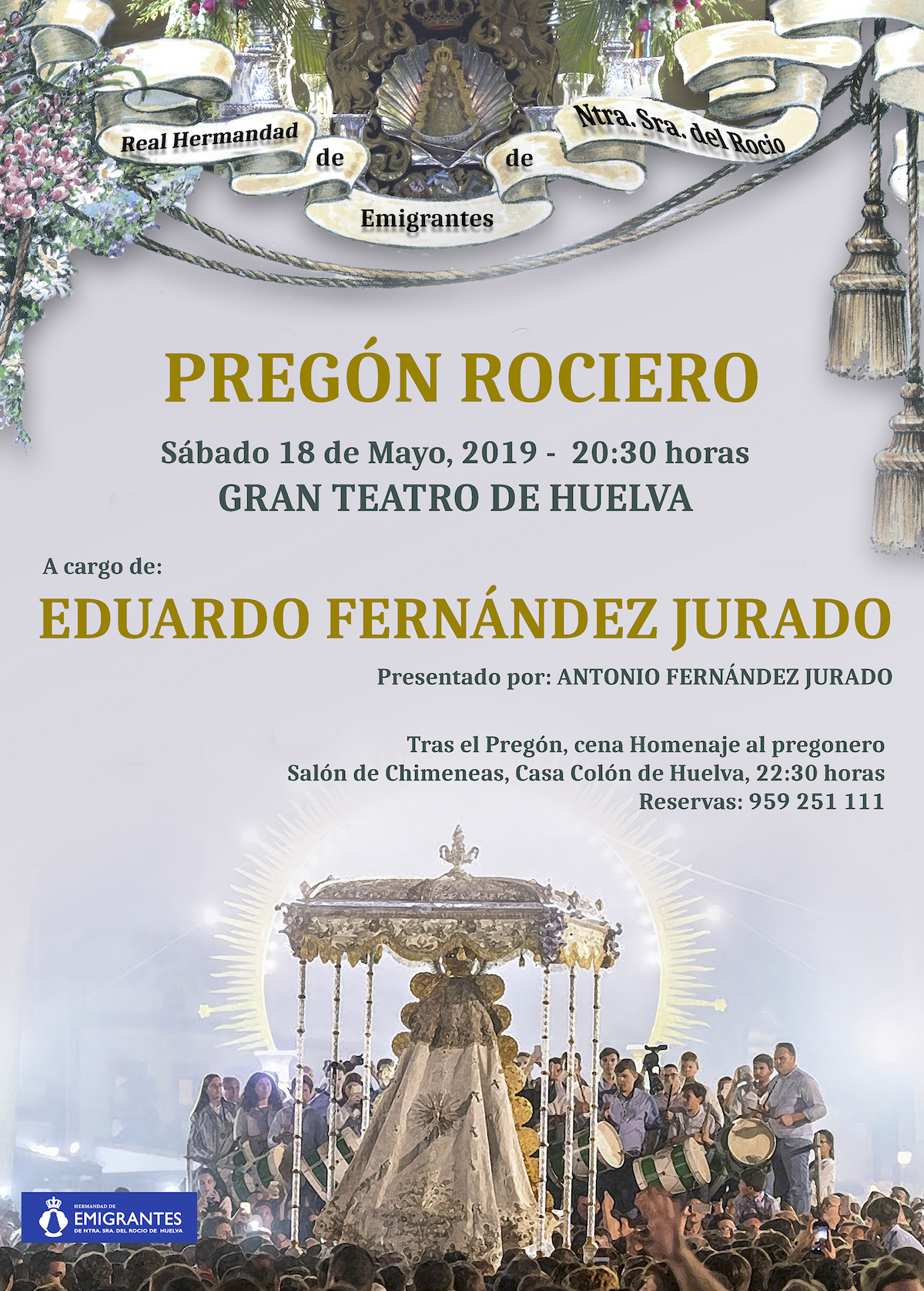 El próximo sábado 18 de Mayo a partir de las 20:30 horas, el Gran Teatro de Huelva acogerá el pregón Rociero de la Hermandad del Rocío de Emigrantes.