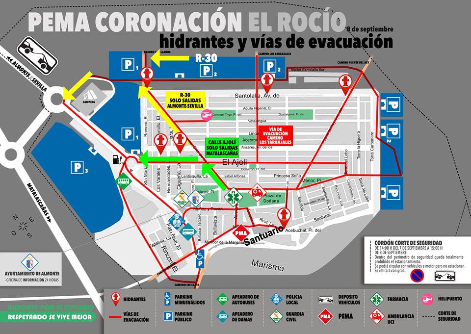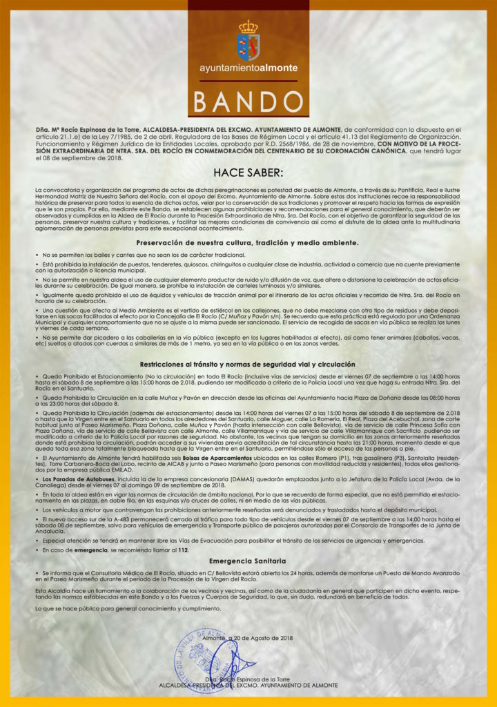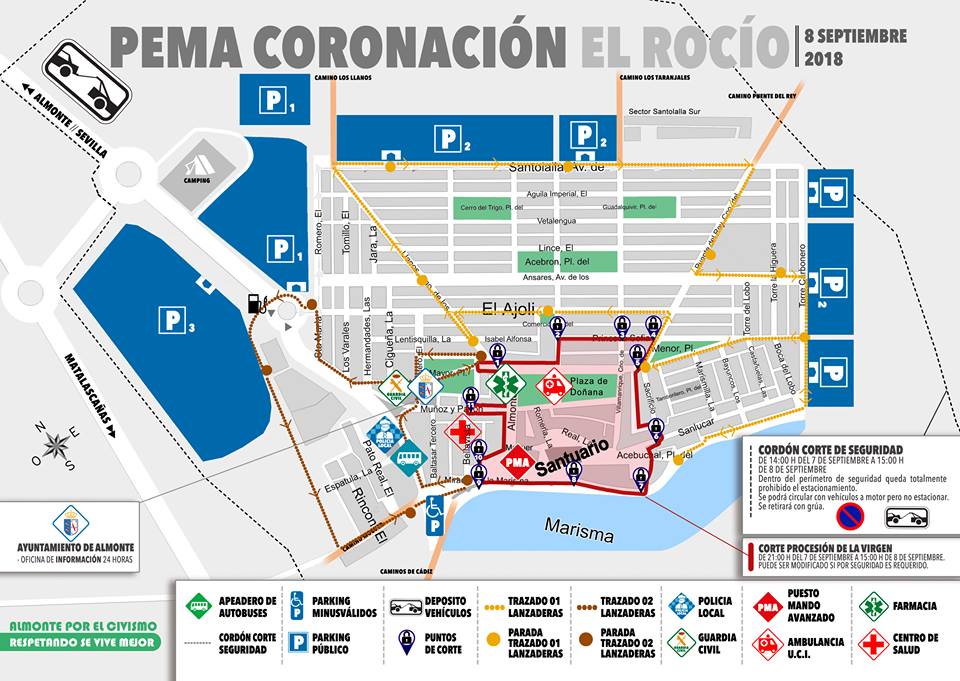 Para ello se han establecido también una serie de medidas y recomendaciones publicadas en un Bando Municipal emitido por el Ayuntamiento, entre las que destaca que se podrá circular pero no estacionar en toda la aldea desde las 14.00 horas del viernes 7 de septiembre hasta las 15:00 horas del sábado 8, o si así lo recomiendan las fuerzas de seguridad, cuando finalice la procesión. Además, desde las 21.00 horas del sábado 7 y mientras dure la procesión no se podrá estacionar y tampoco circular ni con vehículos ni con caballos en el perímetro por el que transcurre la misma.
