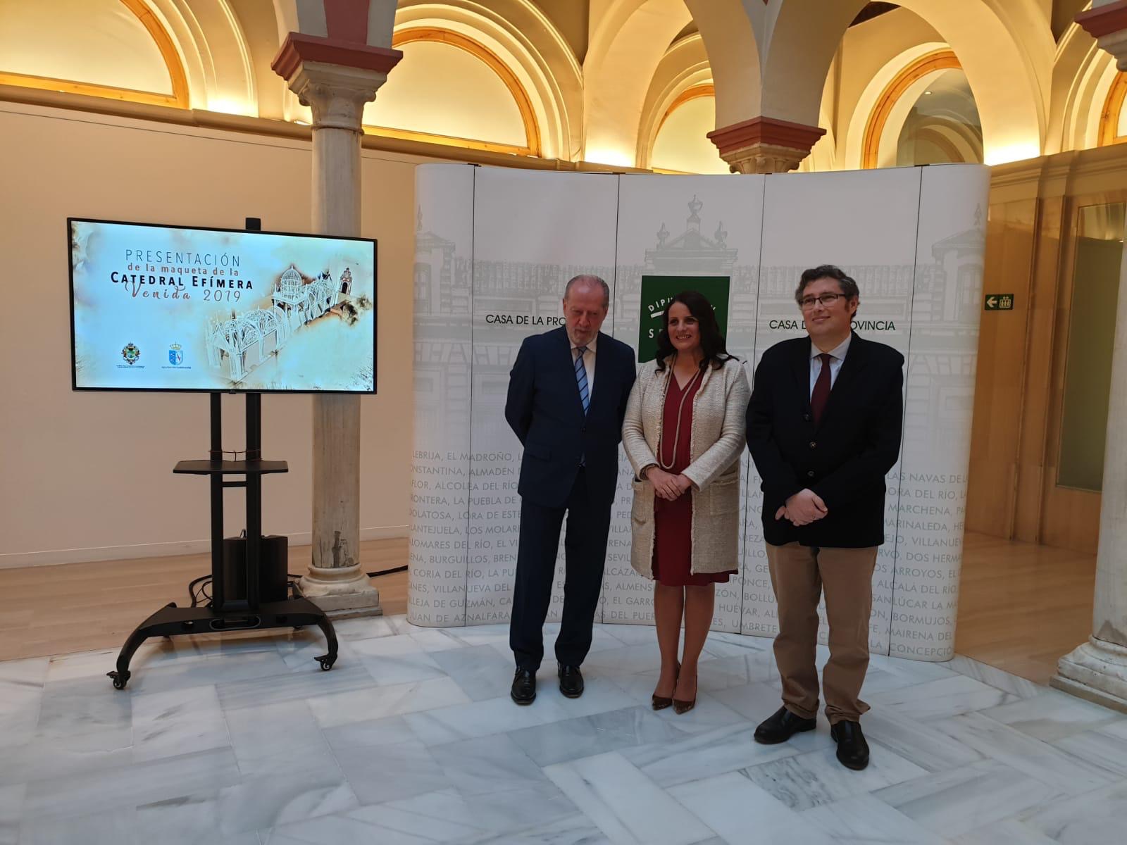 El Ayuntamiento de Almonte y la Hermandad Matriz del Rocío de Almonte han presentado hoy en la Casa de la Provincia de Sevilla la maqueta de la nueva Catedral Efímera que dará la bienvenida a la Virgen del Rocío a la llegada a su pueblo tras el traslado que la tradición marca cada siete años y que se producirá entre los días 19 y 20 del próximo mes de agosto. La alcaldesa de Almonte, Rocío Espinosa, destacó que “estamos ante la catedral efímera más importante del mundo. Una obra que condensa la fusión de grandes artistas y empresas que participan en su construcción con el amor de un pueblo entero, que se encarga de adornarla con sus tradicionales flores de papel como materialización de lo que para él significa su Patrona”.