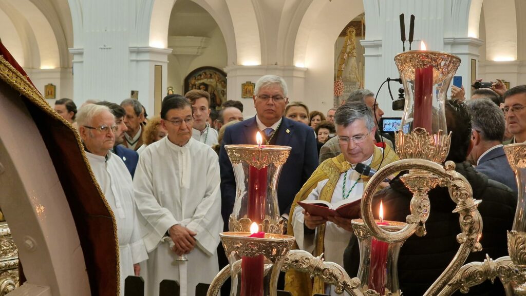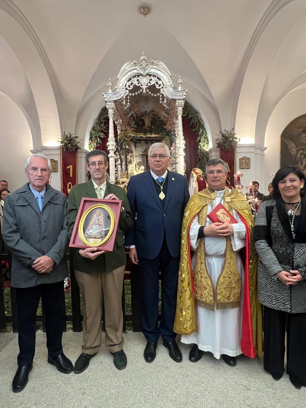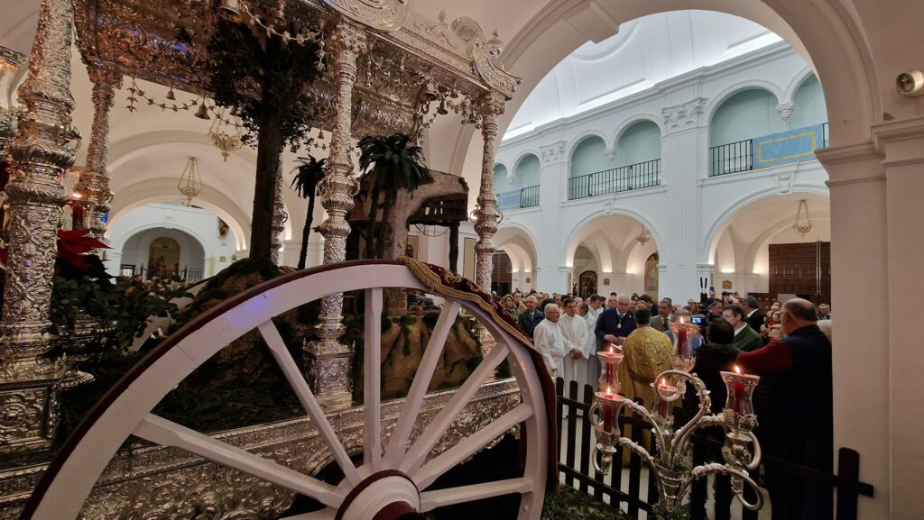 Tras la Vigilia de la Inmaculada, ha sido bendecido el Belén del Santuario. Se erige este año sobre la carreta de la Hermandad del Rocío de Carrión de los Céspedes, con motivo de su centenario.