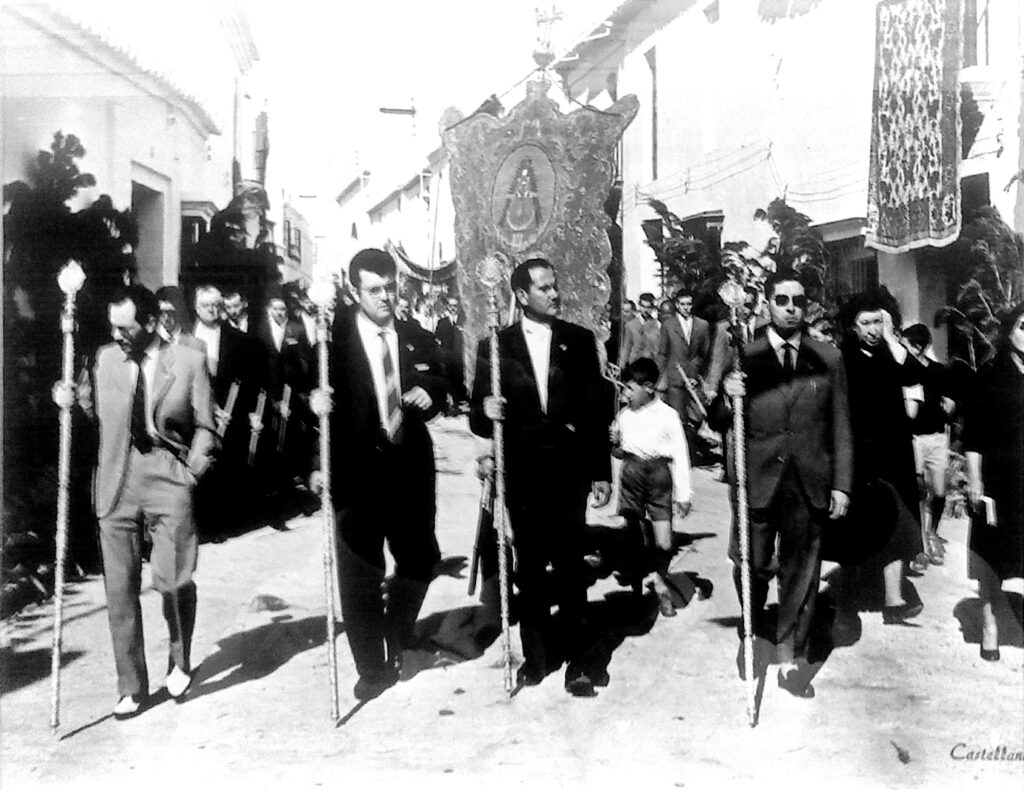 Foto de la Procesión del Corpus del año 1963. En primer término la Presidencia de la Hermandad Matriz.De izquierda a derecha aparecen José Galindo, José Pérez, Hermano Mayor, recientemente fallecido, Antonio Villegas y Santiago Padilla.