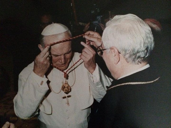 El Presidente de la Hdad. Matriz, Don Ángel Díaz de la Serna y Carrión impone la medalla de la Matriz a S.S. el Papa Juan Pablo II, hoy ya San Juan Pablo II