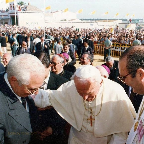 Por otra parte, es consolador comprobar que vuestros pastores muestran gran solicitud y preocupación por fomentar en las hermandades una mayor formación cristiana, una más activa participación litúrgica y caritativa en la vida de la Iglesia, que se traduzca en verdadero dinamismo apostólico. Por mi parte y apelando al sentimiento más profundo que como cristianos y rocieros, llevais en el fondo de vuestras almas, y por Ella a Cristo, dando así también testimonio de una fe que se hace cultura. Sería una pena que esa cultura cristiana vuestra, profundamente enraizada en la fe, se debilitara por inhibición o por cobardía al ceder a la tentación y al señuelo – que hoy se os tiende – de rechazar o despreciar los valores cristianos que cimentan la obra de la devoción a María y dan savia a las raíces del Rocúio. Por esos os vuelvo a insistir hoy ante la Virgen: dad testimonio de los valores cristianos en la sociedad andaluza y española.