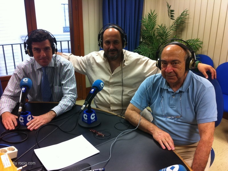 En la imagen aparecen Juan Ignacio Reales, Vicepresidente primero de la Hdad. Matriz con Antonio Mª Lebreros en plena realización de su entrevista del pasado día 18 de mayo, en los estudios centrales de COPE Andalucía y en la otra imagen, Santiago Padilla, Antonio Mª Lebreros y Diego Ramírez en el programa del día 1 de junio.