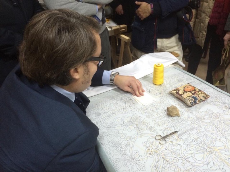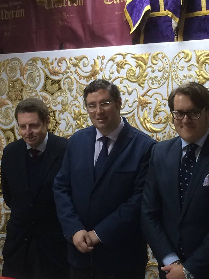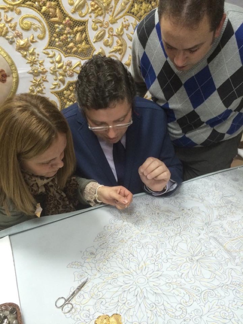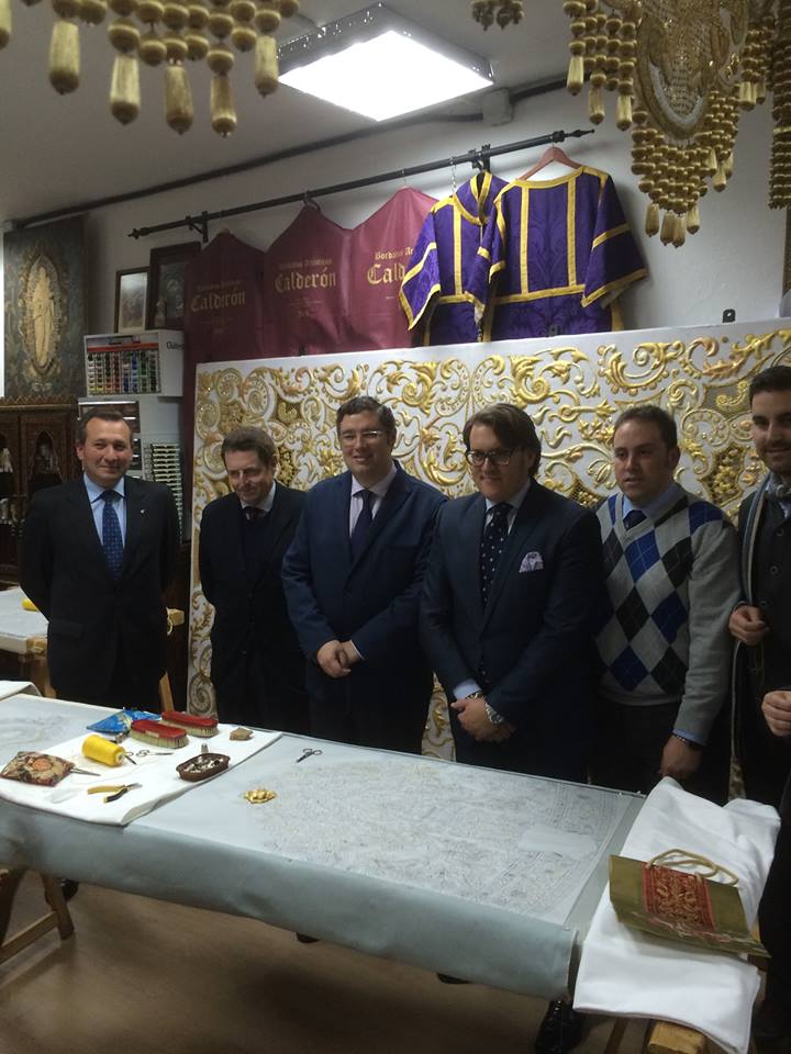 El Presidente de nuestra Hermandad, esta tarde en Jerez, procede a dar la primera puntada del nuevo termo de la Virgen, en el taller del prestigioso bordador, D. Fernando Calderon. En este emotivo acto simbólico, lo han acompañado, miembros de su Junta de Gobierno, la Camarista de la Virgen y el Hermano Mayor de la Hdad. de Jerez.