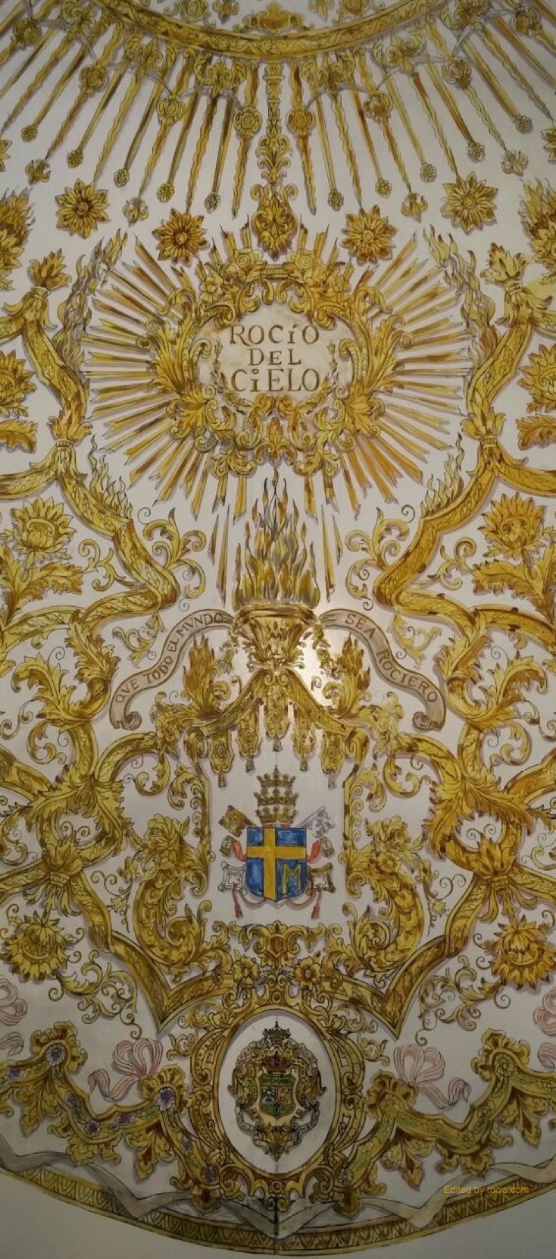 En la saya y el manto se pueden ver las letras de las sevillanas de Muñoz y Pabón 'La Virgen del Rocío no es obra humana', también el escudo de Juan hablo II, la advocación 'Rocío del cielo', el escudo del Rey Felipe VI, el escudo pontificio, el de Jerez, el de Almonte, el de la hermandad Matriz y el del Papa Francisco