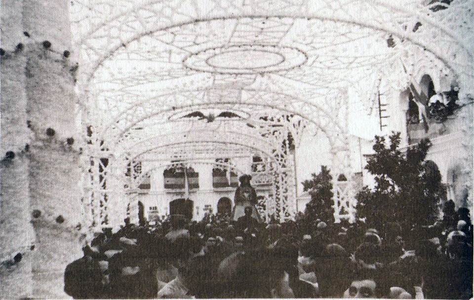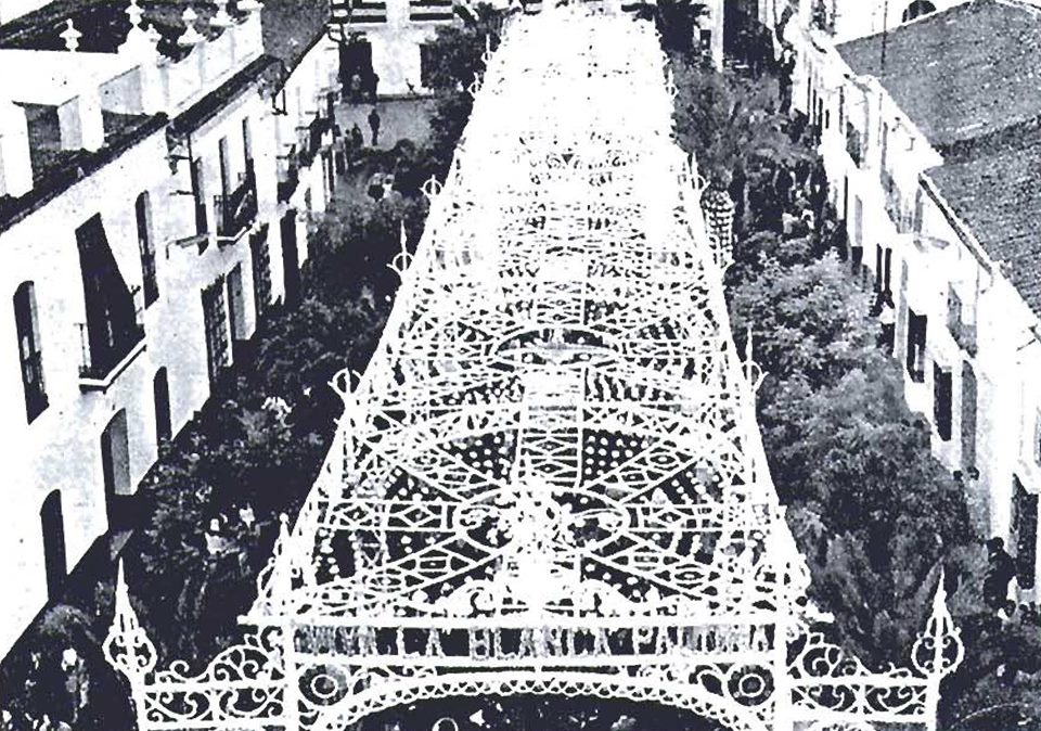 Las primeras referencias de la ornamentación para recibir a la Patrona, data de 1887, colocándose dos arcos de romeros en las calles Venida de la Virgen y El Cerro. Pronto comenzaría a introducirse cadenetas de papel y las actuales flores de seda. En la Plaza, conocida como «El Paseo», levantaban una decoración muy modesta hasta que Juan Muñoz intervino realizando y colocando un arco de madera de gran envergadura en la Venida de 1949. Es conocida como el primer arco de madera.
