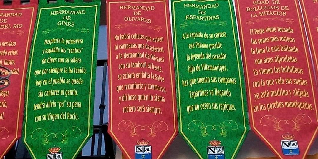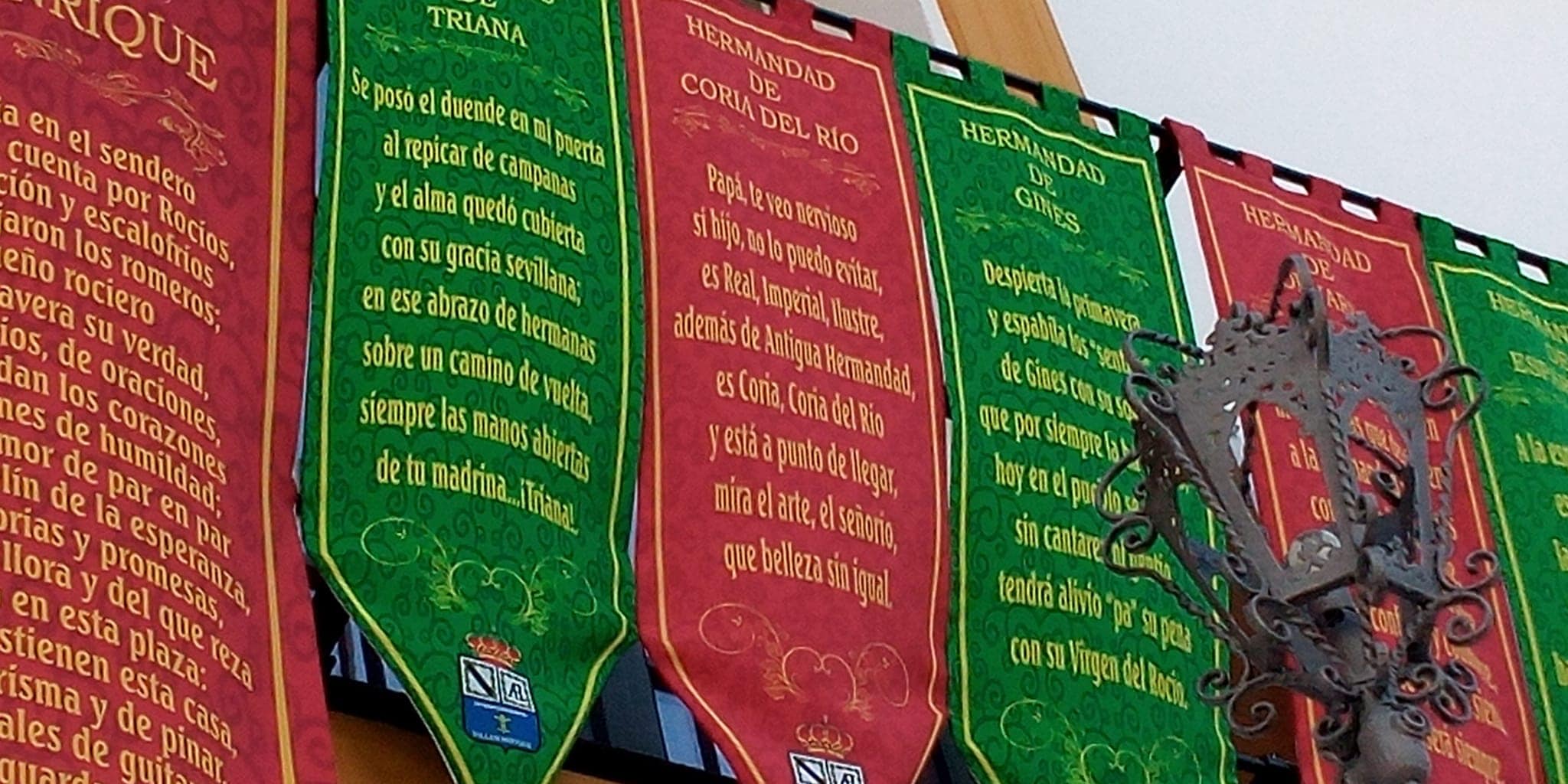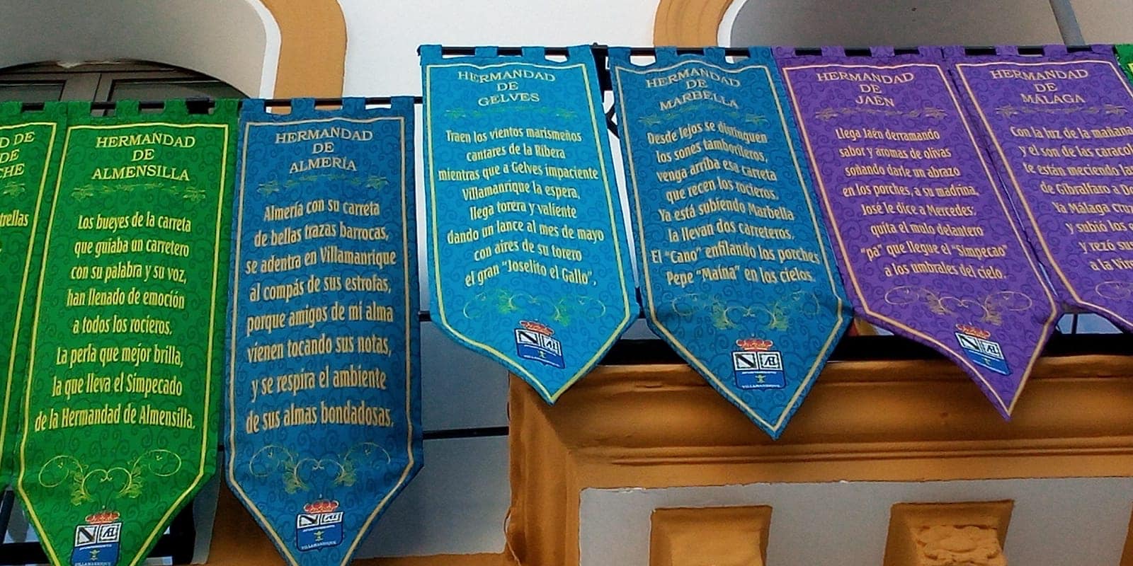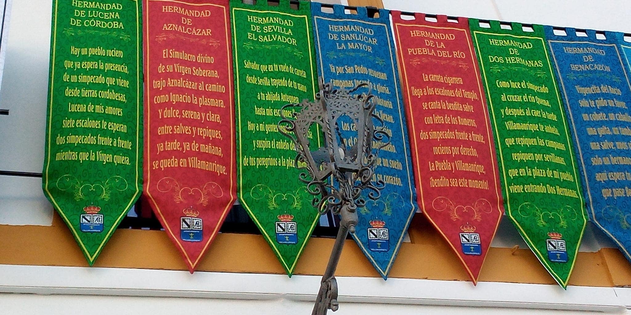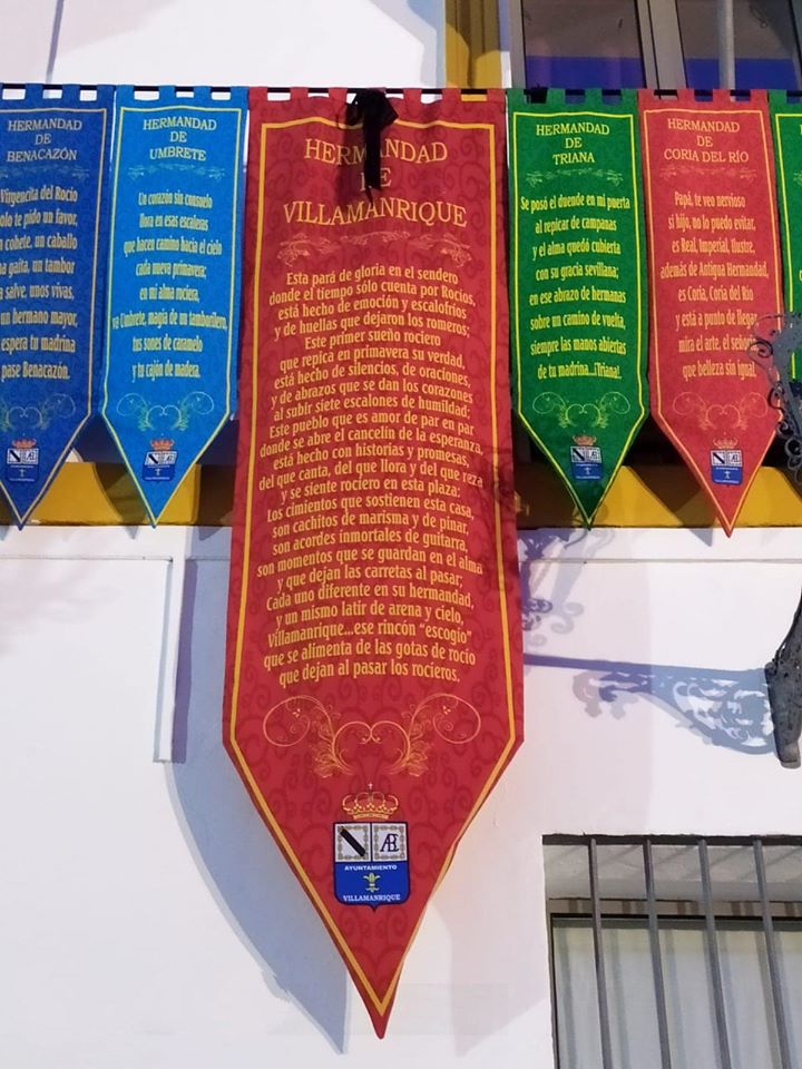 El pueblo de Villamanrique de la Condesa adorna su plaza del Ayuntamiento con un bello gesto hacia todas las Hermandades que tienen paso por su plaza en nuestro caminar hasta la Blanca Paloma.