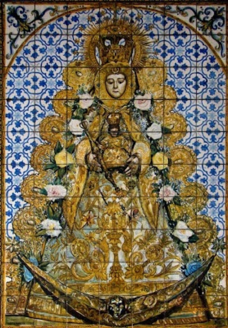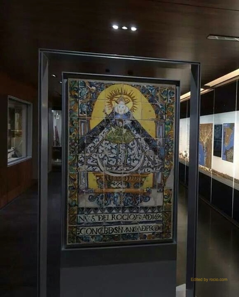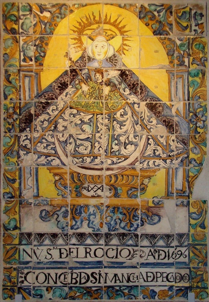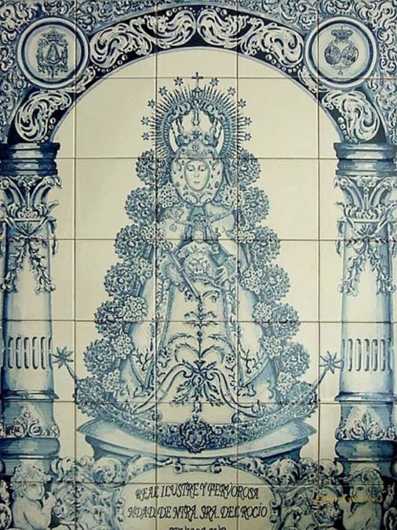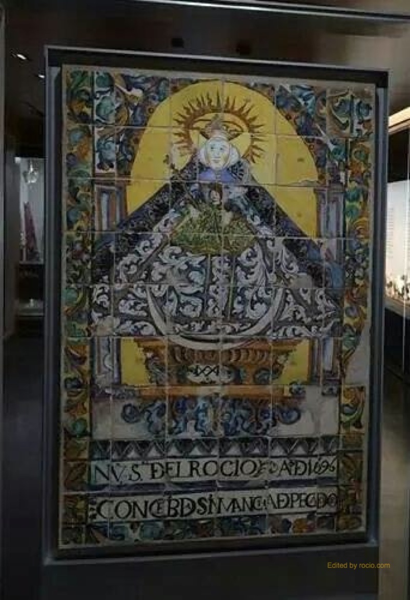 El retablo de azulejos más antiguo que se conoce con la representación de la Virgen del Rocio… finales del siglo XVII… 1696.. estaba colocado en una hornacina con frotón en el dintel de la puerta que daba a la llamada sala de los milagros y que sería la puerta principal de la anterior ermita medieval orientada al sur.. .dando a la «ervina»… y que resultó muy dañada por el terremoto de Lisboa en 1755.