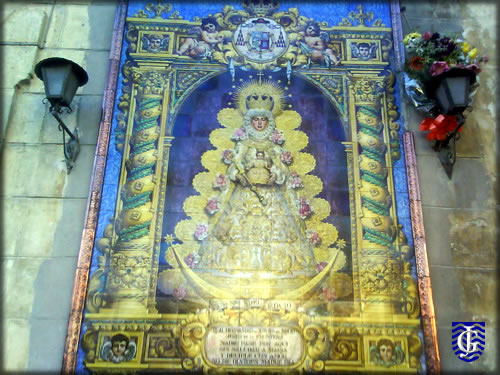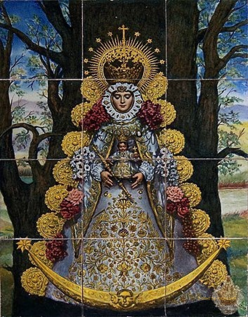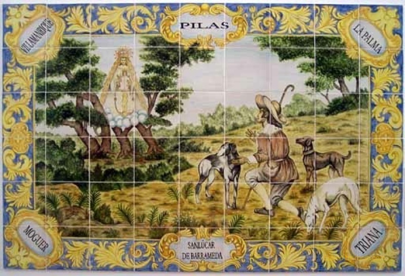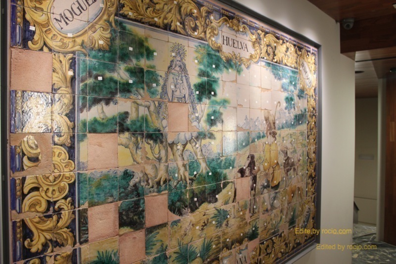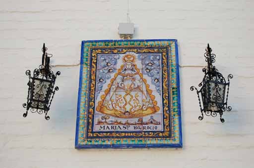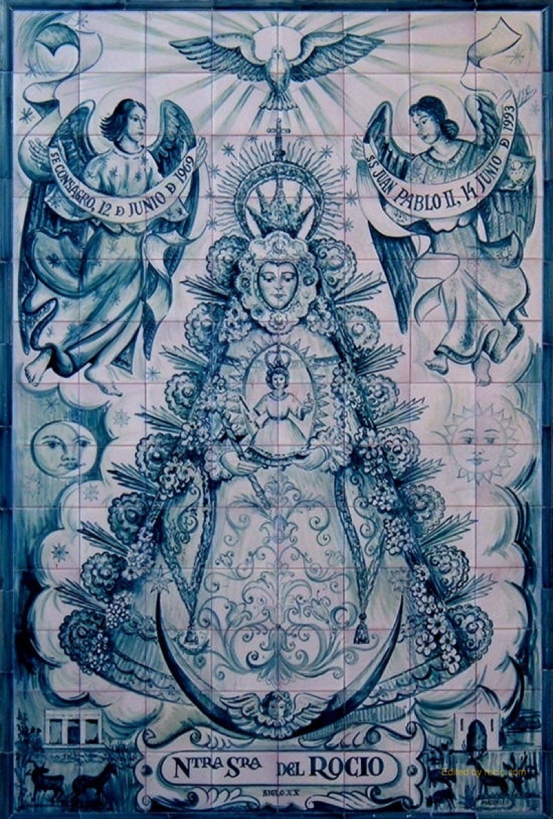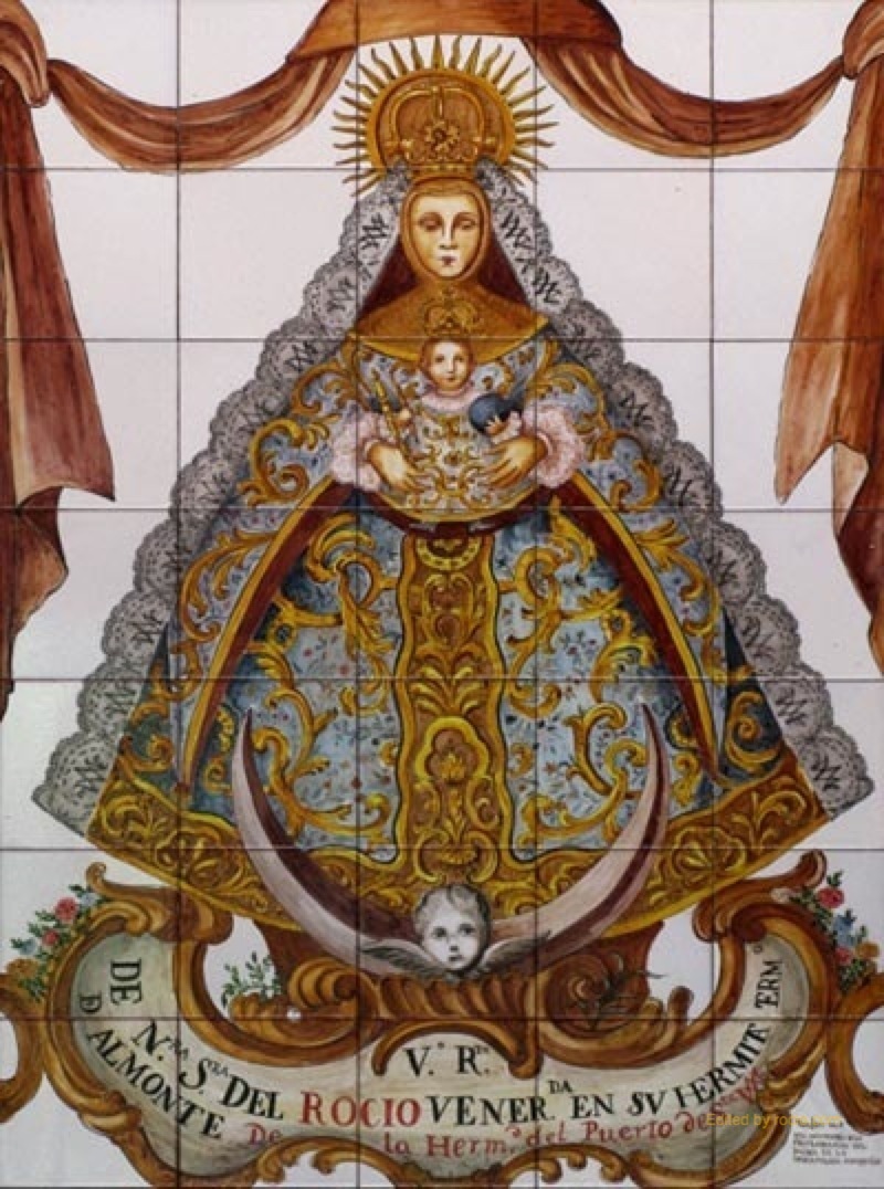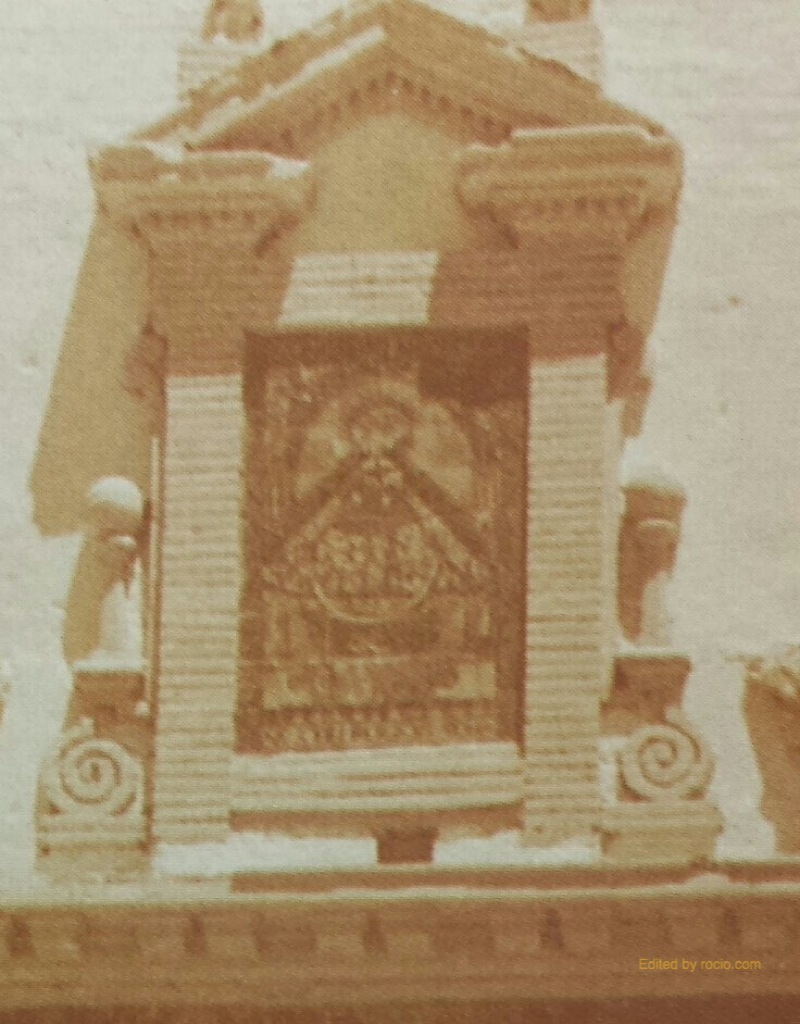 El retablo de azulejos más antiguo que se conoce con la representación de la Virgen del Rocio… finales del siglo XVII… 1696.. estaba colocado en una hornacina con frotón en el dintel de la puerta que daba a la llamada sala de los milagros y que sería la puerta principal de la anterior ermita medieval orientada al sur.. .dando a la «ervina»… y que resultó muy dañada por el terremoto de Lisboa en 1755.