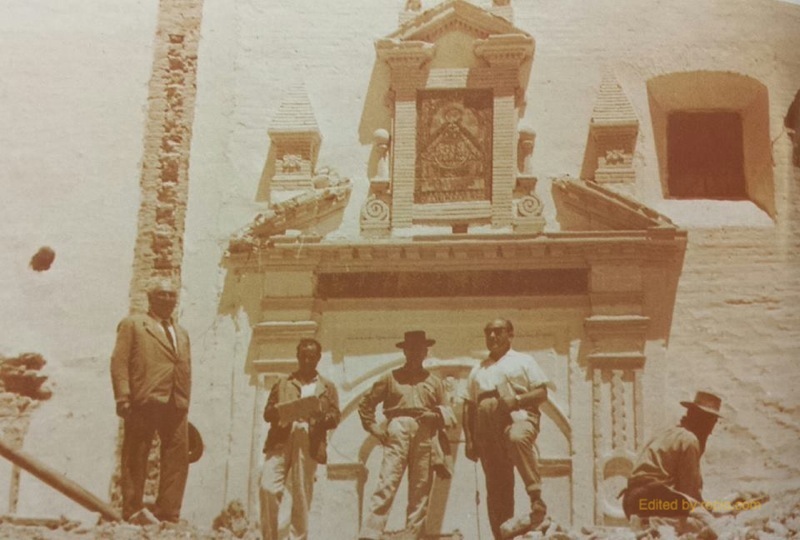 Aqui lo vemos colocado sobre la puerta en esta foto de 1963 tomada en las labores de derribo de la anterior ermita …. hoy lo podemos contemplar en el nuevo museo de los tesoros la Virgen en el triforio del santuario.