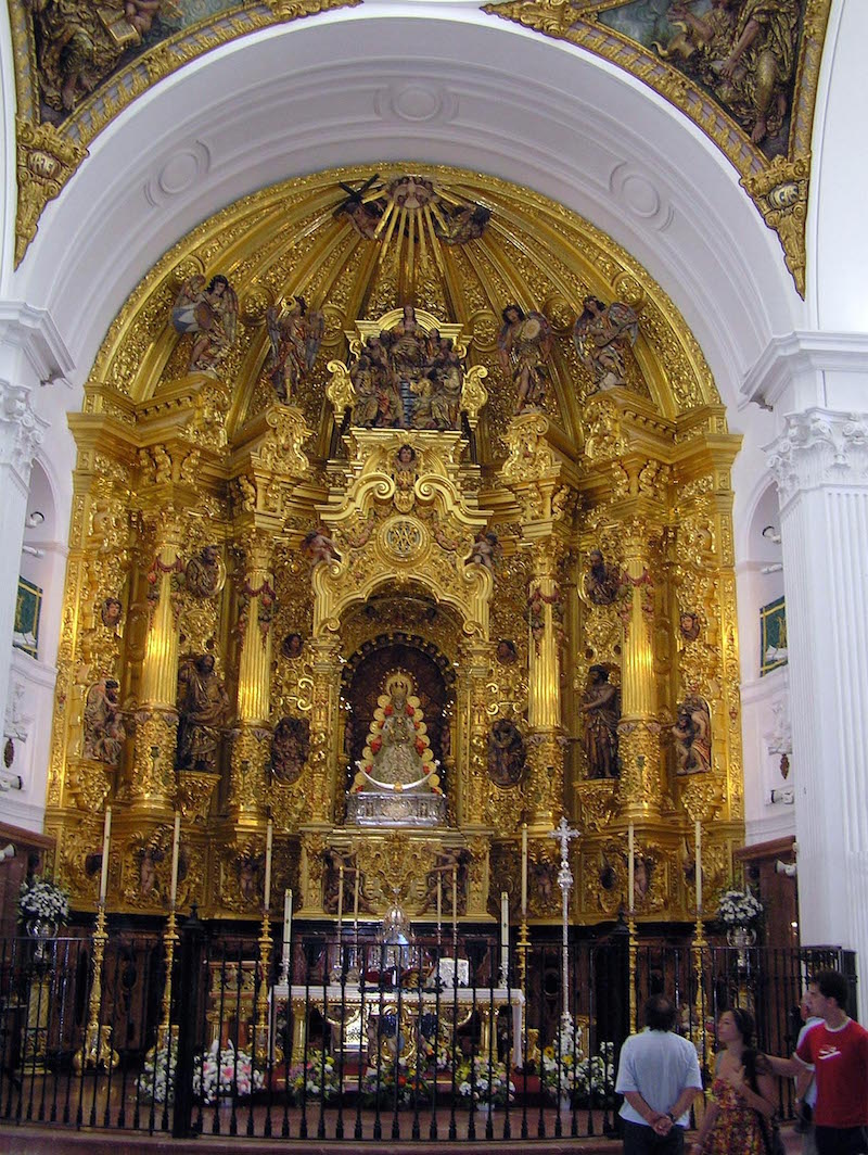 En el retablo actual está representados los Ángeles tocando instrumentos propios de la fiesta rociera; los doctores de la Iglesia, San Ambrosio, San Agustín, San Gregorio, y San Jerónimo; los Apóstoles Pedro y Pablo; el Nacimiento de Cristo; La Anunciación; San José y San Juan Bautista; el Bautismo de Jesús; La Visitación; y en la parte superior, ocupando un lugar principal, Pentecostés.