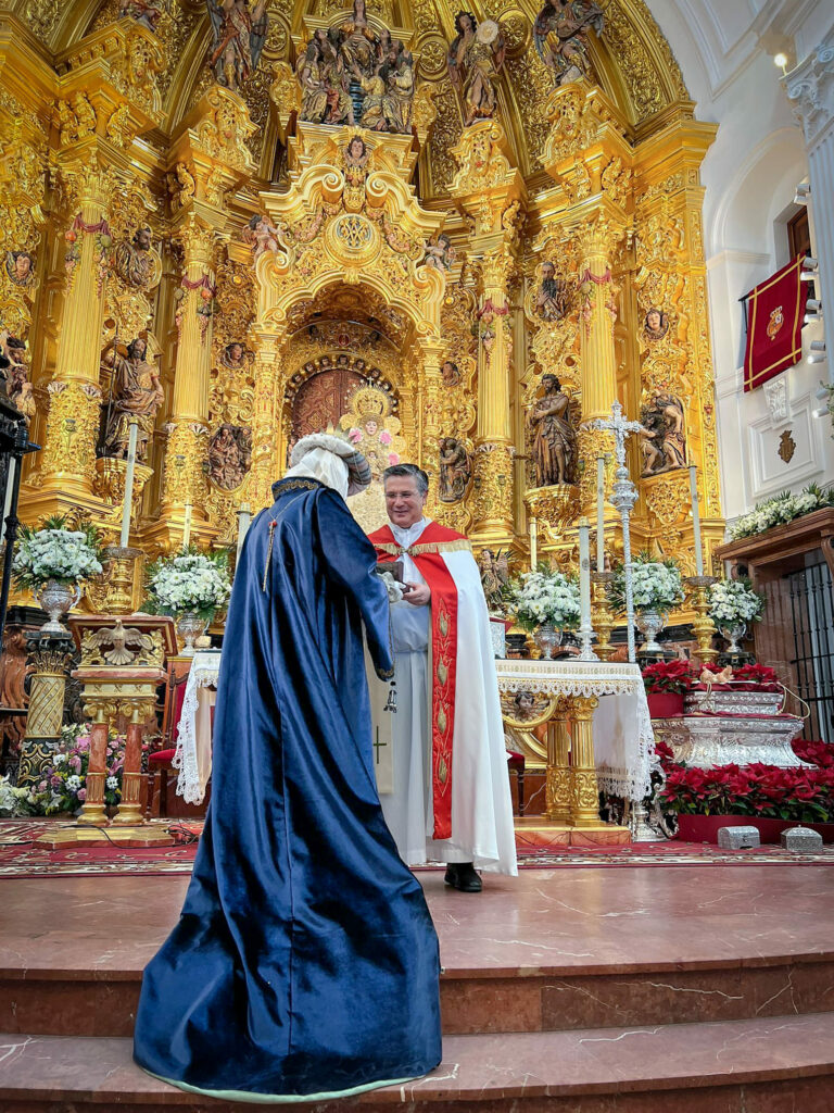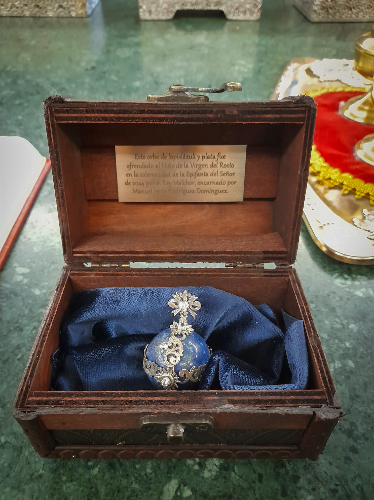 El Rey Melchor, encarnado por Manuel Jesús Rodríguez Domínguez, hizo entrega de un orbe para el Niño de la Virgen. Realizado en lapislázuli natural con inclusiones de pirita, con meridianos y paralelos de plata de ley con decoración de hojas barrocas, al igual que la cruz que lo corona.