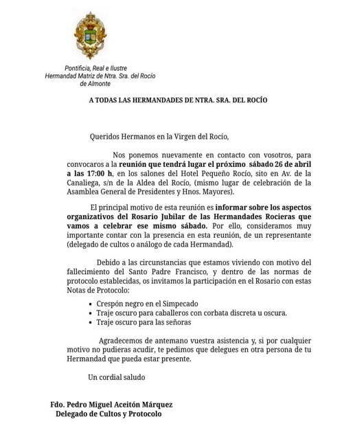 Acaba el comunicado añadiendo que «este Rosario va a recordar el Rosario de las Hermandades que se celebraba en la Romería, hasta la última década del siglo XX. Y será la ocasión de hacer un gran acto de Comunión y de Hermandad Rociera».