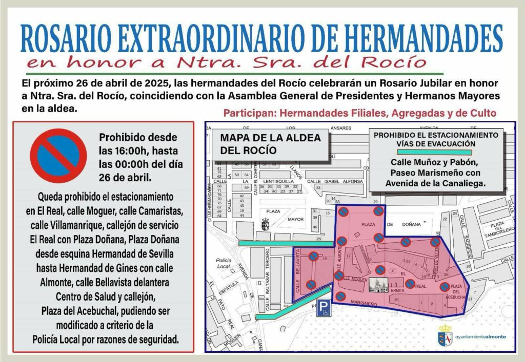 La Hermandad Matriz de Almonte acaba de hacer público que, tras la celebración de la Asamblea General de Presidentes y Hermanos Mayores el próximo 26 de abril, y que este año se celebrará en la aldea del Rocío, no en el pueblo, «ha invitado a todas sus hermandades (Filiales, Agregadas y de Culto) para celebrar un Rosario Público Extraordinario por las calles de la aldea del Rocío esta misma noche, tras la Eucaristía que celebrará este día por la tarde, el Excmo. Sr. Obispo, Mns. Santiago Gómez Sierra».