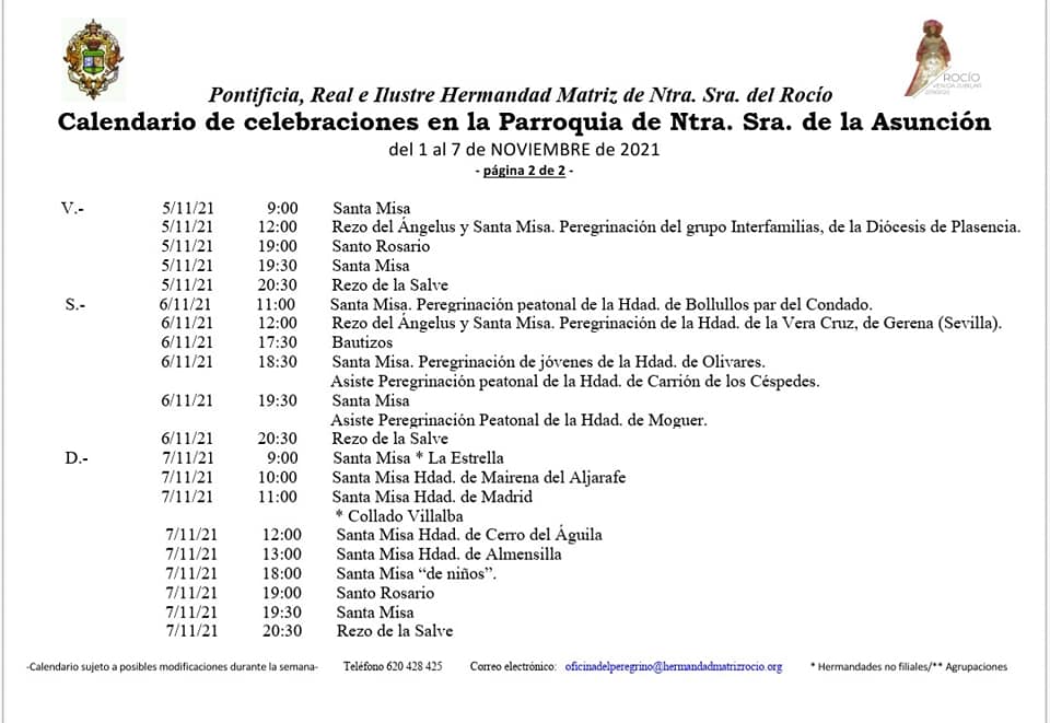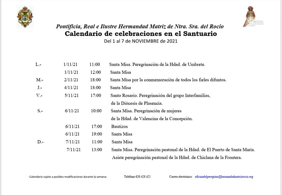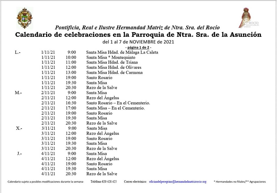 Calendario de celebraciones para la semana del 1 al 7 de noviembre, en la Parroquia de Ntra. Sra. de la Asunción y en el Santuario de Ntra. Sra. del Rocío.