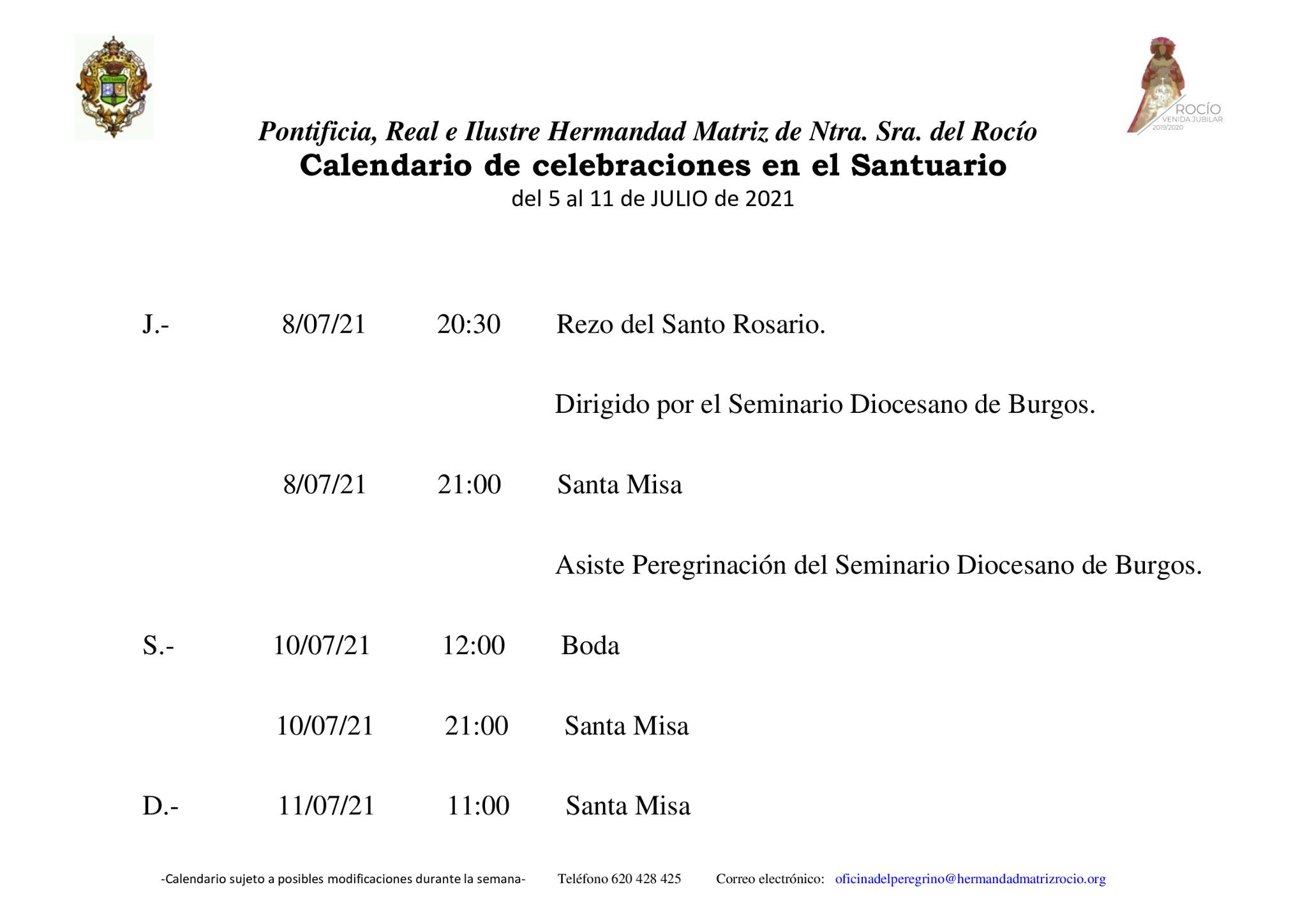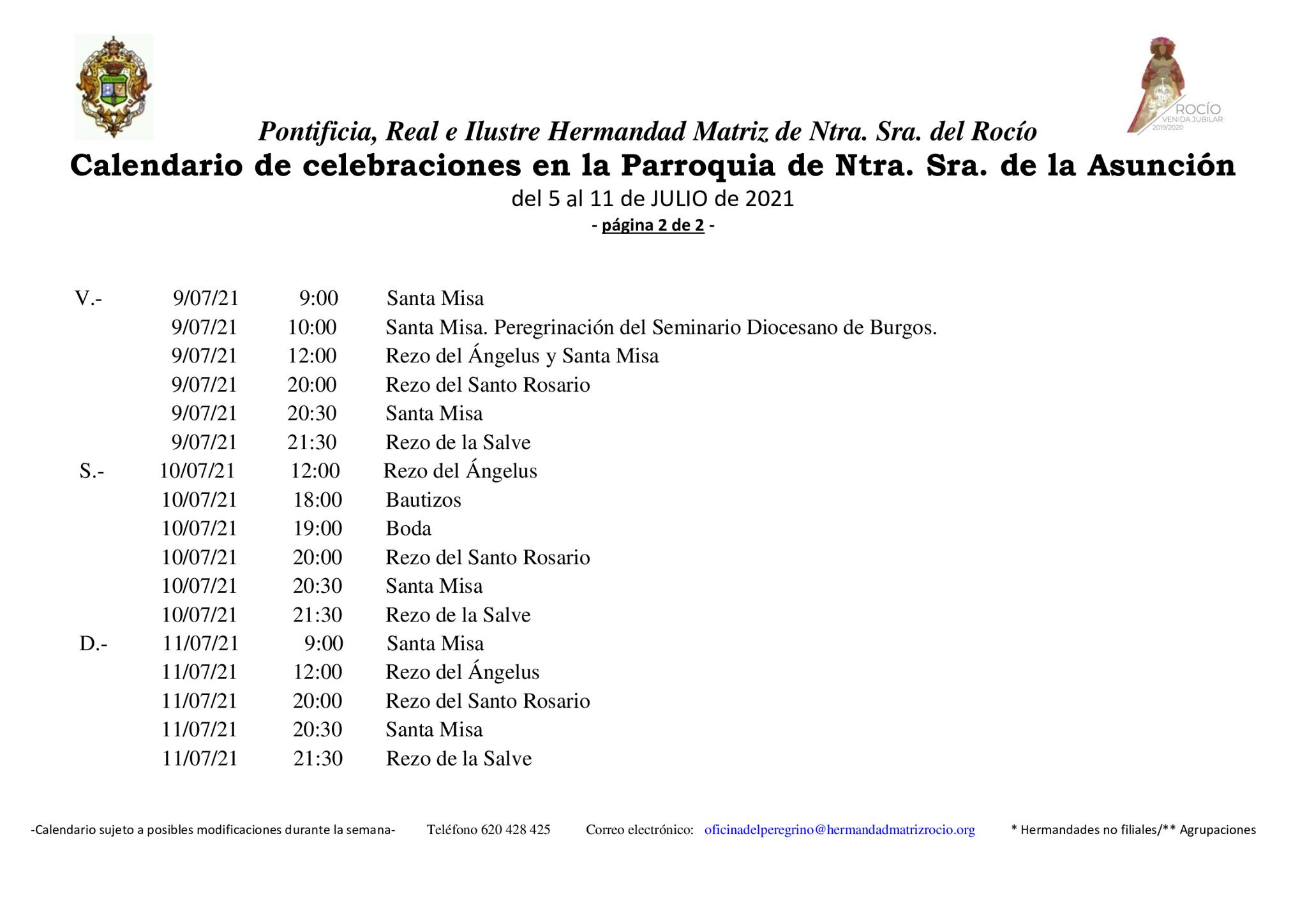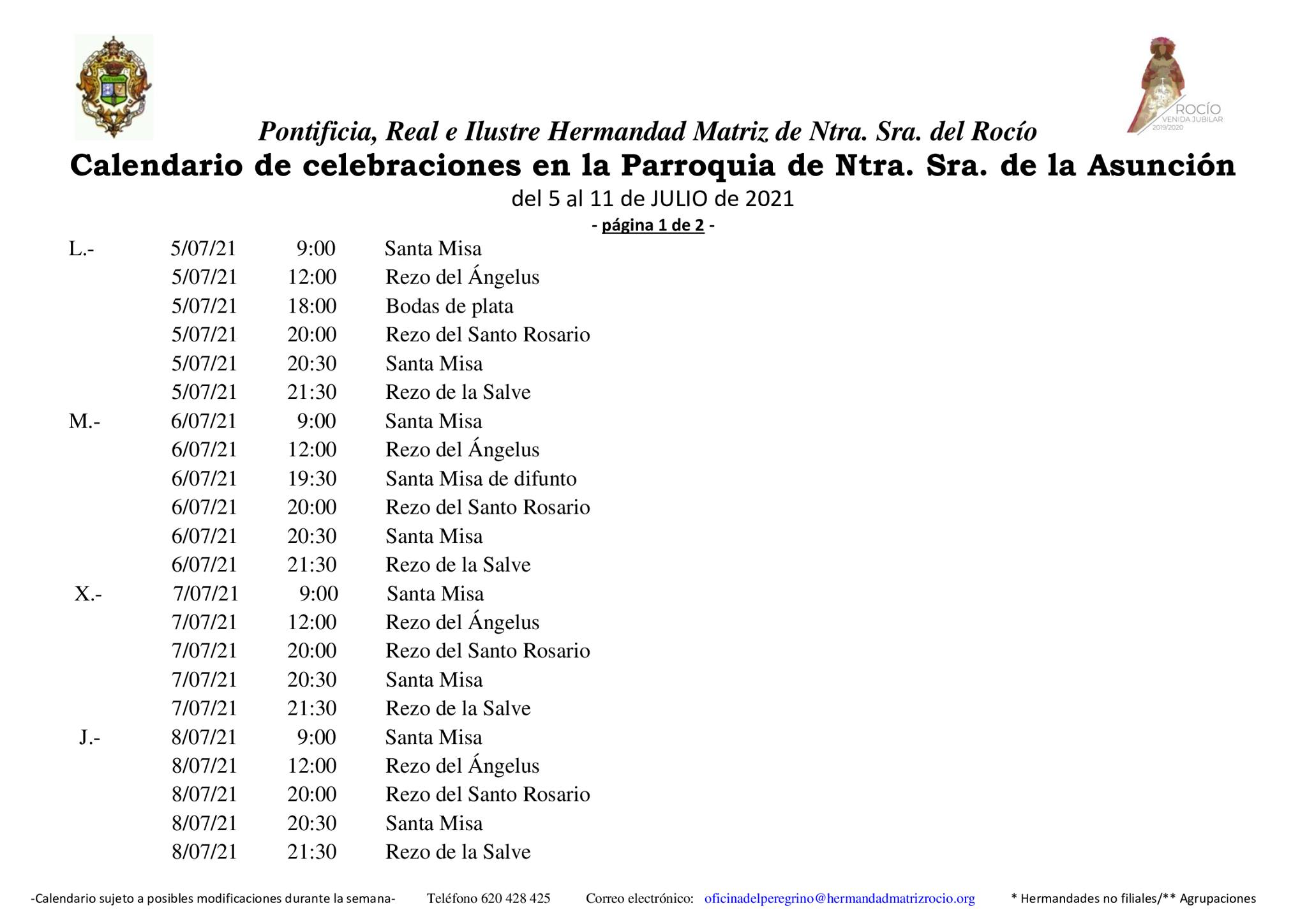 Calendario de celebraciones para la semana del 5 al 11 de julio, en la Parroquia de Ntra. Sra. de la Asunción y en el Santuario de Ntra. Sra. del Rocío.