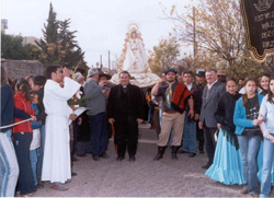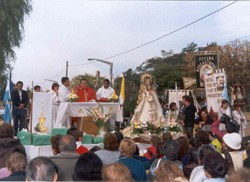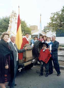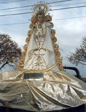 El 17/08/03 estando ya la imagen lista, la sacamos de casa a las 8 de la mañana y fue vestida en el jardín de casa, luego la colocamos en un Yeep del Ejército Argentino, adornadas con dos niñas vestidas de andaluzas y dos varones de gauchos (mis nietos) estos portaban las banderas Argentina, Española, Andaluza y Papal ya en carabana nos diriguimos a la vuelta de casa que esta la emisora de radio de la familia NOvello_ Fuentes. (mi yerno y mi hija) y ya con los móviles entonabamos sevillanas y a las diez calles, estaba el Padre Alberto Olivera, en la puerta de la Parroquia de Fatima, para bendecirla, luego de la bendición y ante la gran multitud de gente que se había congregado las chicas bailaron sevillanas, en ese momento fue entregada al pueblo Sanluiseño y a los gauchos para su justodia, ya en la proseción a hombro la Virgen y rodeada de los gauchos, empezó su recorrido a su casa nueva, la Iglesia de la Sagrada Familia.