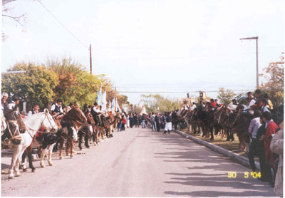 Al llegar a la Iglesia de la Sagrada Familia, sus custodios 110 gauchos, unidos en una sola Agrupaciòn y formando la GRAN CABALLERIA para la Blanca Paloma con sus banderas y estandartes, montados en sus caballos con monturas tìpicas, adornadas con monedas de plata le formaron el cordòn de bienvenida a ambos lados de la calle y,entre pètalos de rosas arrojadas a su paso, ondear de banderas y aplausos, y al compàs de la mùsica que nos brindaba la Banda del Ejèrcito Argentino llegò al altar donde era esperada por el Padre Alberto Olivera, con la emociòn de tan hermosa romerìa rociera.
