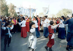 Fuimos acompañados por 50 Rocieros del coro de San Juan y 30 de la Mendoza San Rafael, ellos le cantaron la Misa Rociera. En el momento de las ofrendas lo hicimos por cada provincia que componen Andalucía( ocho), las niñas vestidas de españoles, llevaban una caja con alimentos para un comedor infantil que funciona en ese lugar.