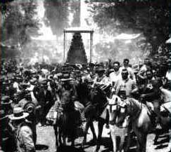 Precedía la cruz alzada de la parroquia de Almonte, seguían en filas por orden de su antigüedad, la última la de Almonte, el clero, el concejo de la villa el gentío. Entrada la procesión, celebrase con toda solemnidad la misa del día y comenzaba el éxodo por el camino de vuelta. »