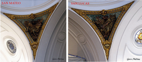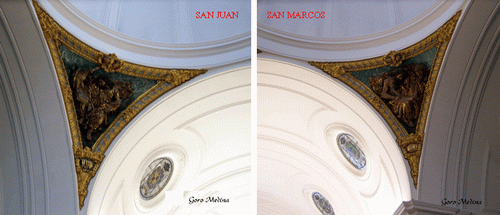 En las cuatro intersecciones de la cruz, nos encontramos a los evangelistas, coincidentes en igual número.